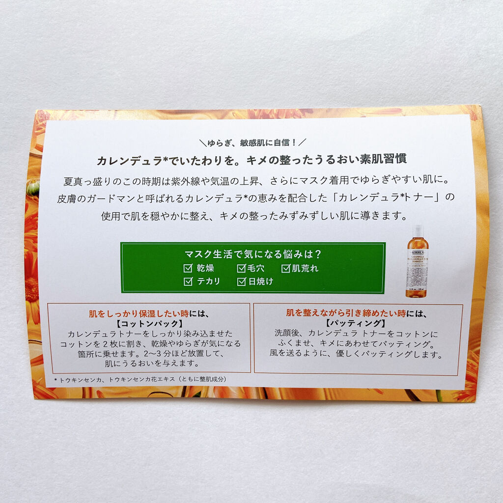 - 「皮膚のガードマン」と呼ばれているカレンデュラの花びら*1をたっぷり配合した、キールズ カレンデュラ トナー。 みずみずしいテクスチャーながらも、カレンデュラの恵み*2で ゆらぎ、敏感*3 になりがちな季節も肌を穏やかに整え、トラブルの起きにくい健康的な素肌に導きます。 デイリー使いで安定素肌習慣*4を! 敏感肌の方もお使い頂けます。 *1 トウキンセンカ(整肌成分)*2 トウキンセンカ、トウキセンカ花エキス(ともに整肌成分) *3すべての方に肌トラブルが起こらないというわけではありません。*4きれいな素肌をキープするための習慣