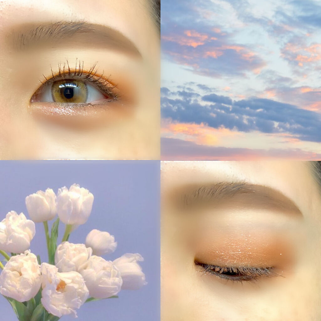 \3つのポイントを押さえて離れ目解消メイク/1.眉頭が目頭より少し内側になるようにパウダーアイブロウで書き足す。2.上瞼の二重幅に入れる中間色を目頭側に広く、目尻側に狭く塗る。point💐(目を開けた時に、ピンクの線の部分に上瞼の中間色が見え...