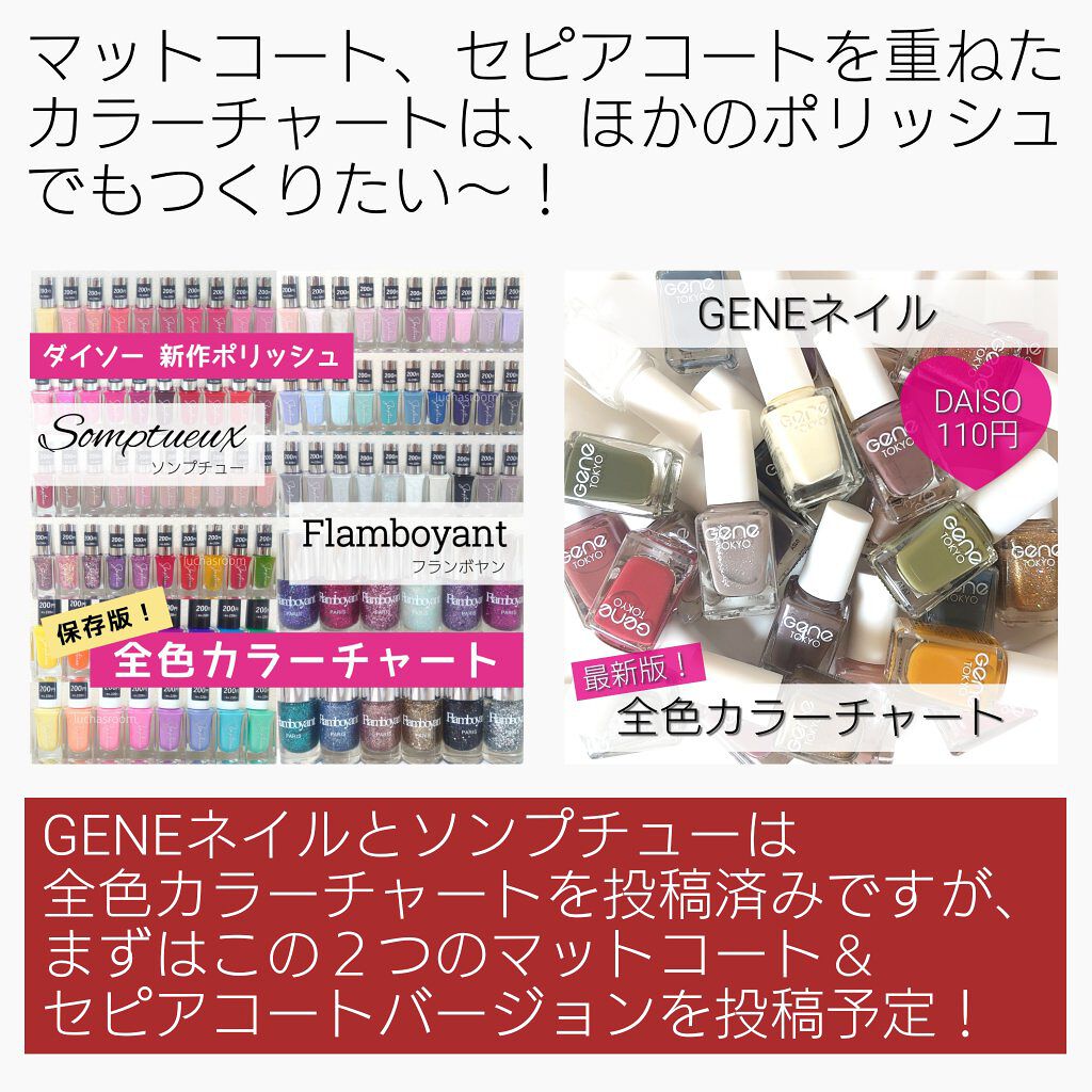 ⚠️更新版投稿しました⚠️こちらのハッシュタグからとべます▶#カラーチャートluchasroom完全保存版‼️ダイソーでネイルポリッシュを買うときに必携!ダイソーの3大ネイルポリッシュ、GENEネイル、フレンドネイル、ソンプチューの全色カラー...