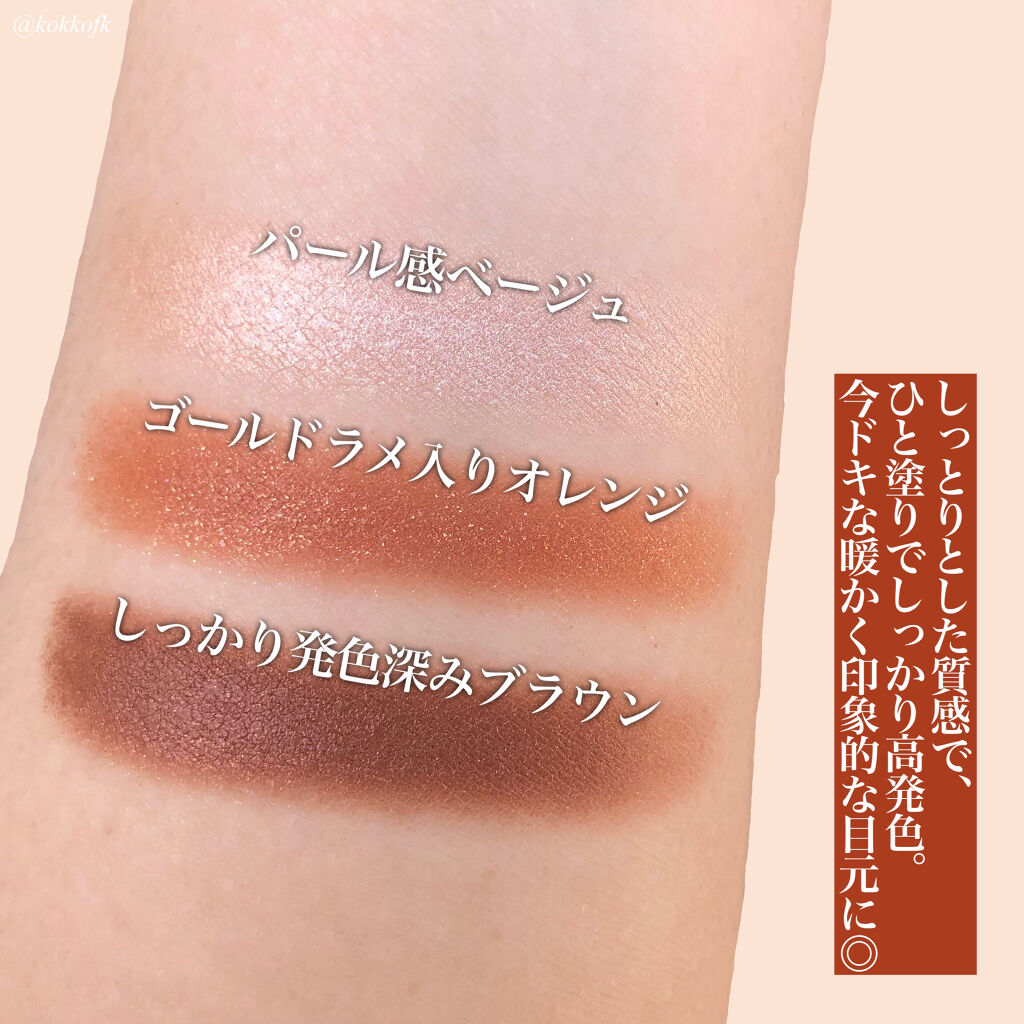 - 3色で簡単に明るく大きな目元に。 しっとり感触のアイシャドウ。 くすみを飛ばす明るさベース、ひとえ・奥二重の方でも幅広く塗れる肌なじみの良い中間色、 濃密高発色の締め色が目の輪郭を強調し大きな目元に。 微細パール配合でくすみを飛ばし、明るい目元へ。