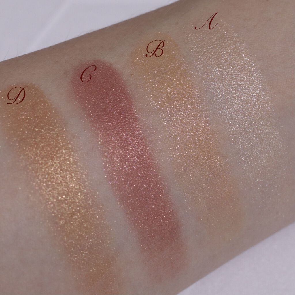 パール感や質感はプチプラとは思えないクオリティーふわふわな質感でしっとりとした濡れツヤ感が出せます。 ハイライト初心者さんはもちろん、使い分けすると色々楽しめるハイライトとなってます✨ 01 シャンパンベージュベーシックなホワイトハイライト。発色がいいのに浮きにくい! 02 パールグロウハイライト馴染みのいいピンクベージュカラーチークの上から重ね使いすると血色感もでて華やか肌質問わず馴染みやすい。 03 オーロラミントやや青みのある偏光パール入りのハイライトブルベさんが得意なカラー透明感と華やかさがこれ一つで叶う 04 シェルピンク高輝度パールがぎっしりライトなピンクで馴染みがいいです。03同様、華やかなハイライト好きさんには◎ 初心者さんが使いやすいのは01.02で、華やかさをプラスしたい方には03.04がおすすめです✨ 鎖骨がでる様子を着る時に、鎖骨部分をキラッとさすと透明感が増しますよ🧚🏻♀️なりたいお肌に合わせて使い分けてみてね💕