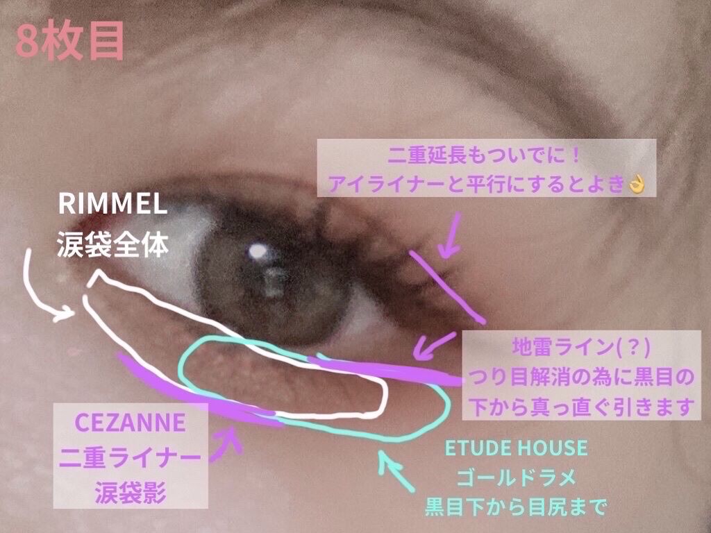 アイメイクのやり方徹底解説します!!! ETUDE HOUSEのプレイカラーアイズ「ミューリーロマンス」の①と②をブラシで混ぜて、アイホール全体と下まぶたに塗ります! アイプチはアストレアヴィルゴのアイビューティーフィクサーWP使ってます。 ZEESEAの茶色使ってます!品番擦れて消えてしまっていた…申し訳ない……! リンメルのショコラスウィートアイズ103番の2つ目の色を涙袋全体に塗ります! CANMAKEのジューシーピュアアイズ12番の真ん中のラメを、目頭の切開ラインを避けるようにくの字で乗せます! まつ毛パーマはセルフでやっているので、つけまつげをつけます!