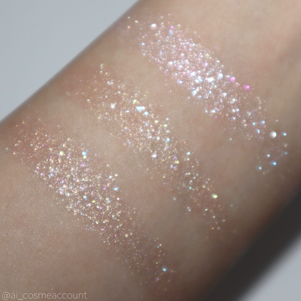 S[SHINY]“高輝度ガラスパール×カラーパールの美しいきらめき”↓S01.ピュアブロンズ“上品に艶めくブロンズゴールド” R[RICH]“リッチな高発色と繊細なツヤで色遊びを楽しめる”↓R01.バニラムスク“光を集めるハイライトベージュ” F[FLUFFY]“ふんわり・しっとりの新感覚 肌と同化するセミマット”↓F01.ラストナイト“血色感を潜ませるメロウなピンク”