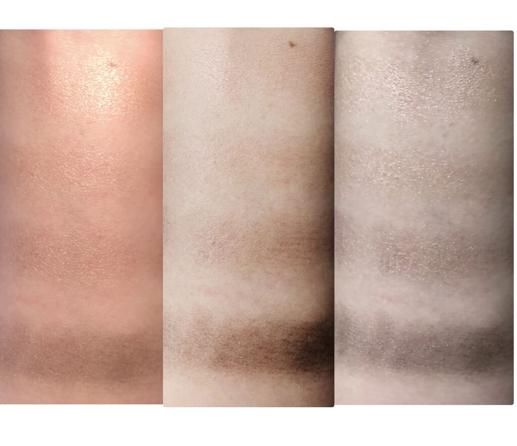 マット3色とグリッター1色がセットになっています。 キャラメルカラーが4色入ったパレットです。 少し赤みが強いブラウン系です。つけると赤みがふわっとさして、ちょっと色気が出る感じになります。 カラーはキャラメル、キャラメルブラウン、ピンク系キャラメルグリッター、ダークキャラメルブラウンです。 グリッターにはピンク、黄色、紫などが入っていて若干偏光ラメになっています。めちゃかわいいです。 くすみベージュ、グレージュ、シャンパンベージュグリッター、スモーキーダークブラウンです。 全体的に超オシャレなグレーカーキ系になります。 グリッターには紫、黄色、少しオレンジなどが入っていて、シャンパンゴールドベースですが偏光ラメで若干青っぽく見えてキレイです。 つけると一気にモードっぽい小洒落た感じになります。量産系メイクには合わないと思いますが、シック系、地雷系、モード系など、ちょっと斜に構えた感じに仕上げたい場合にはめちゃくちゃ馴染みます。