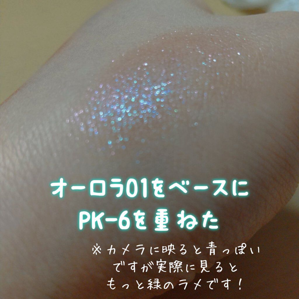 ☄️オーロラみたいな偏光ラメアイシャドウ💫🌟UGパウダーアイシャドウPK-6パウダーアイシャドウなので、パサパサ・ザラザラした感じ。かなりラメ落ちしますがブルーグリーン系のラメで凄く綺麗✨(かなり前に購入したので今は売ってない可能性があります...