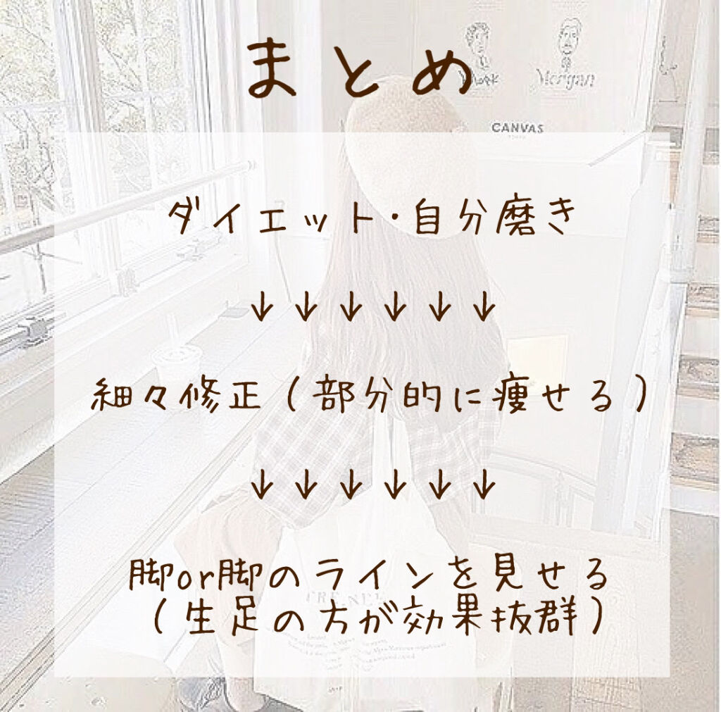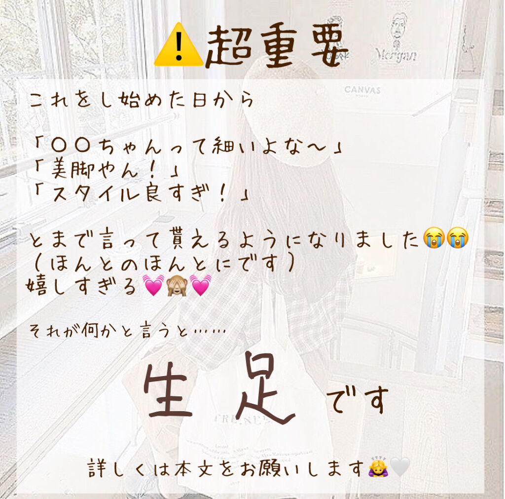 「足細くない??」「細すぎる」「スタイル良すぎ!」 何が違うかと言うと自分のスタイルの見せ方です!! 「ダイエット」いやーな響きですね。私はこれ嫌いです笑けどスタイル良くしたいんだったらここは通らなくちゃいけないので一緒に頑張りましょう✊👊🔥 全体痩せ → 部分痩せ ・食事制限・有酸素運動 私は運動嫌いなので食事制限だけしてました! とにかくご飯を普通の人と合わせる! もっと痩せたい方は食事制限してその次に有酸素運動だんだんしていきましょう👍 私は「脚」と「腹」ですね。憎きぶよぶよども😠 私に一番効いたのは『浮腫とり』です!!!! ・お風呂上がった後にマッサージ(半身浴オススメです¨̮⑅*)(めんどくさくて私やってません笑) ・着圧スパッツを履く お水を一日2L飲んだら痩せた!ってよく聞いたので朝、ご飯食べる前、寝る前などなど合間をとってお水じゃなく「ぬるま湯」ちゃんと飲みました。