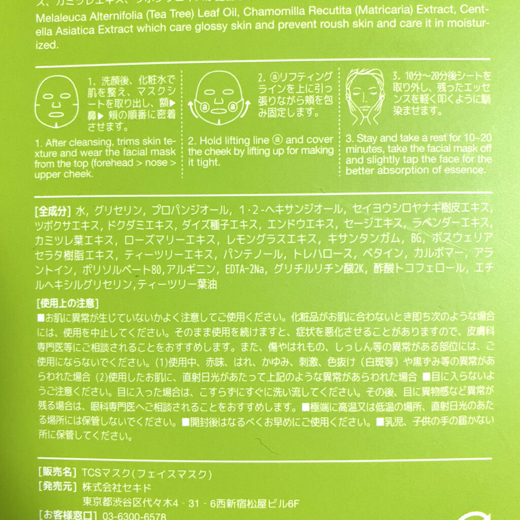 - <10枚入り> 水、BG、グリセリン、キサンタンガム、カルボマー、グリチルリチン酸2K、ティーツリー葉油、セージエキス、アルギニン、プロパンジオール、エチルヘキシルグリセリン、ツボクサエキス、ドクダミエキス、トレハロース、ダイズ種子エキス、ベタイン、酢酸トコフェロール、パンテノール、1,2-ヘキサンジオール、アラントイン、ローズマリーエキス、EDTA-2Na、セイヨウシロヤナギ樹皮エキス、ポリソルベート80、ボスウェリアセラタ樹脂エキス、エンドウエキス、ラベンダーエキス、カミツレエキス、レモングラスエキス、ティーツリーエキス <1枚> 水、BG、グリセリン、キサンタンガム、カルボマー、グリチルリチン酸2K、ティーツリー葉油、セージエキス、アルギニン、プロパンジオール、エチルヘキシルグリセリン、ツボクサエキス、ドクダミエキス、トレハロース、ダイズ種子エキス、ベタイン、酢酸トコフェロール、パンテノール、1,2-ヘキサンジオール、アラントイン、ローズマリーエキス、EDTA-2Na、セイヨウシロヤナギ樹皮エキス、ポリソルベート80、ボスウェリアセラタ樹脂エキス、エンドウエキス、ラベンダーエキス、カミツレエキス、レモングラスエキス、ティーツリーエキス