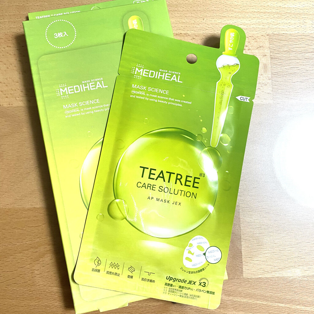 肌荒れ防止🌿韓国フェイスパック🇰🇷 "MEDIHEAL ティーツリーケア ソリューション エッセンシャルマスクEX" ティーツリーやシカ配合の鎮静系🌿 さっぱりした使用感だけどしっかり潤いも与えてくれます🫧 コスパ良くて使いやすい🙆♀️ 手軽に使えるのが嬉しい✌️