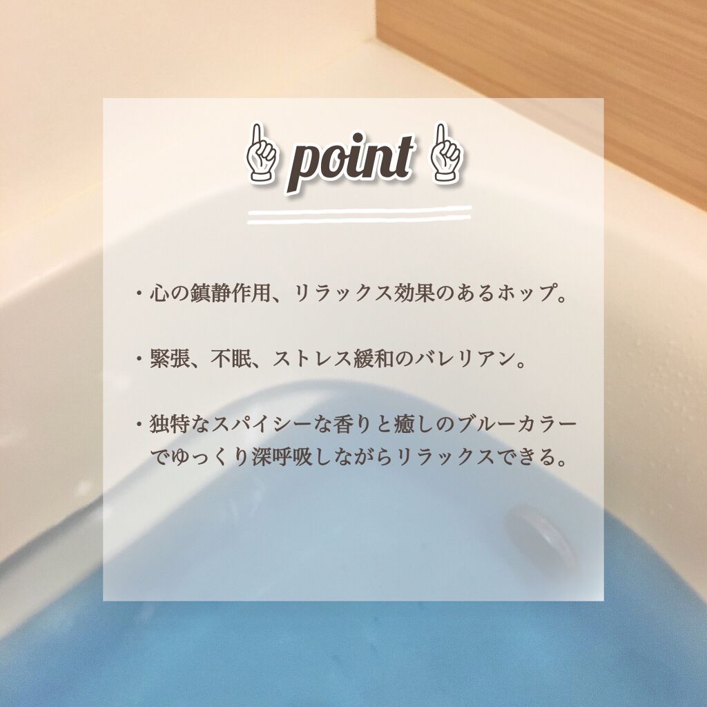 グーテナハトバスソルトホップ&バレリアンの香り・睡眠の質が上がると聞き気になっていたときにlipsで見つけ購入。・浴槽に入れる前は香りが強すぎて不安になったが、入れて混ざるといい香りで癒された。・お湯の色が結構な青さになって驚いた。着色料はい...
