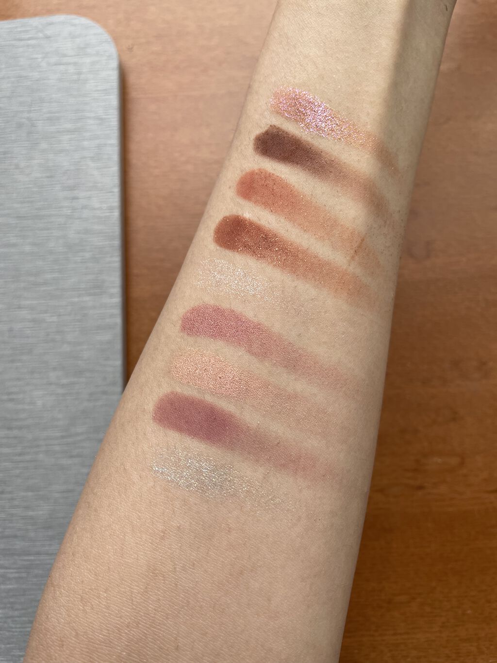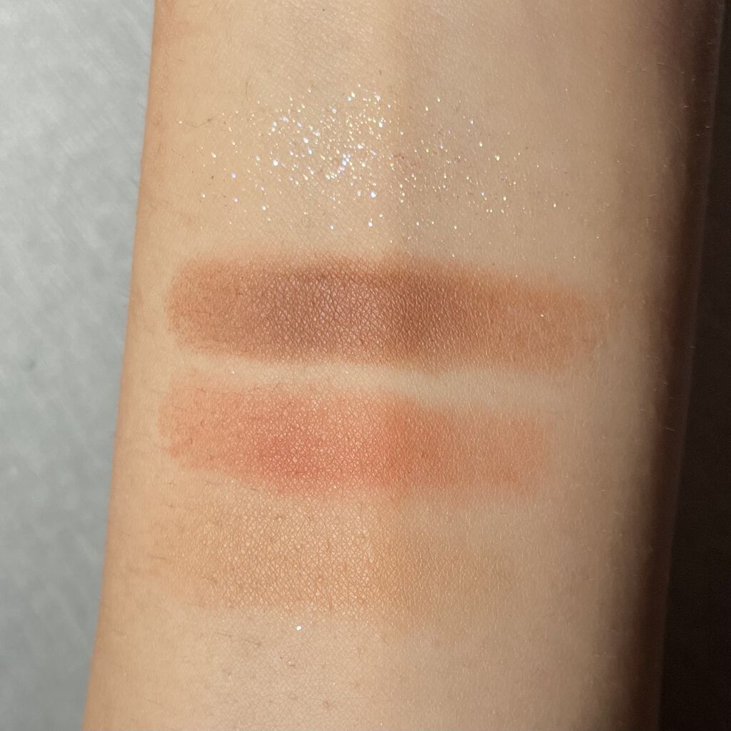 柔らかいピンクブラウンです。本命のブラウンと駆け引きのピンクのハーフみたいで、ナチュラルな陰影を残しつつも、かわいらしいパレットになっています💕 黄土色のマットシャドウに、メタリックなレッドカラー。比較的濃いカラーは無いので、ピンクを締め色としてもかわいい✨ 今回はどちらとも、ハイライトがバームタイプになっています!これからの時期、乾燥しやすいのでめちゃくちゃありがたい、、!