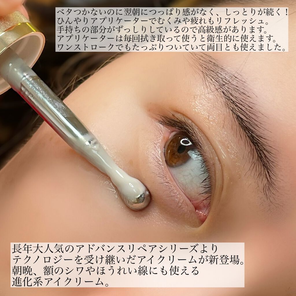 - 目もとの肌を引き締め、くっきりとした印象の目へ導くアイクリーム。 毎日1万回以上繰り返されるまばたきなどの動きが、ダメージ(*1)の要因となることに着目。繊細な目もとの肌をクッションのようにやさしく包み込んで支える360°マトリックス テクノロジー(*2)を採用。さらに従来製品(*3)の2倍のヒアルロン酸Na配合で、24時間(*4)集中保湿。 乾燥による小ジワを目立たなくし(*5)、ふっくらハリのある目もとへ。 *1 乾燥や乾燥による小ジワ、ハリの低下 *2 粘弾性ポリマーとヒアルロン酸Naからなり、うるおいを与え、すこやかな目もとを保つテクノロジー *3 アドバンス ナイト リペア アイ S コンプレックス II *4 朝・晩問わず24時間いつでも使用できること *5 効能評価試験済 ●使用方法 朝晩、洗顔、化粧水、美容液の後ご使用ください。 マッサージ アプリケーターを使用し、目の下をそれぞれ 3回ずつ優しくロールします。 続けて、目の下からまぶたの上に向かって360°の円を描くようになじませます。最後に、薬指でやさしくたたきこむようになじませます。