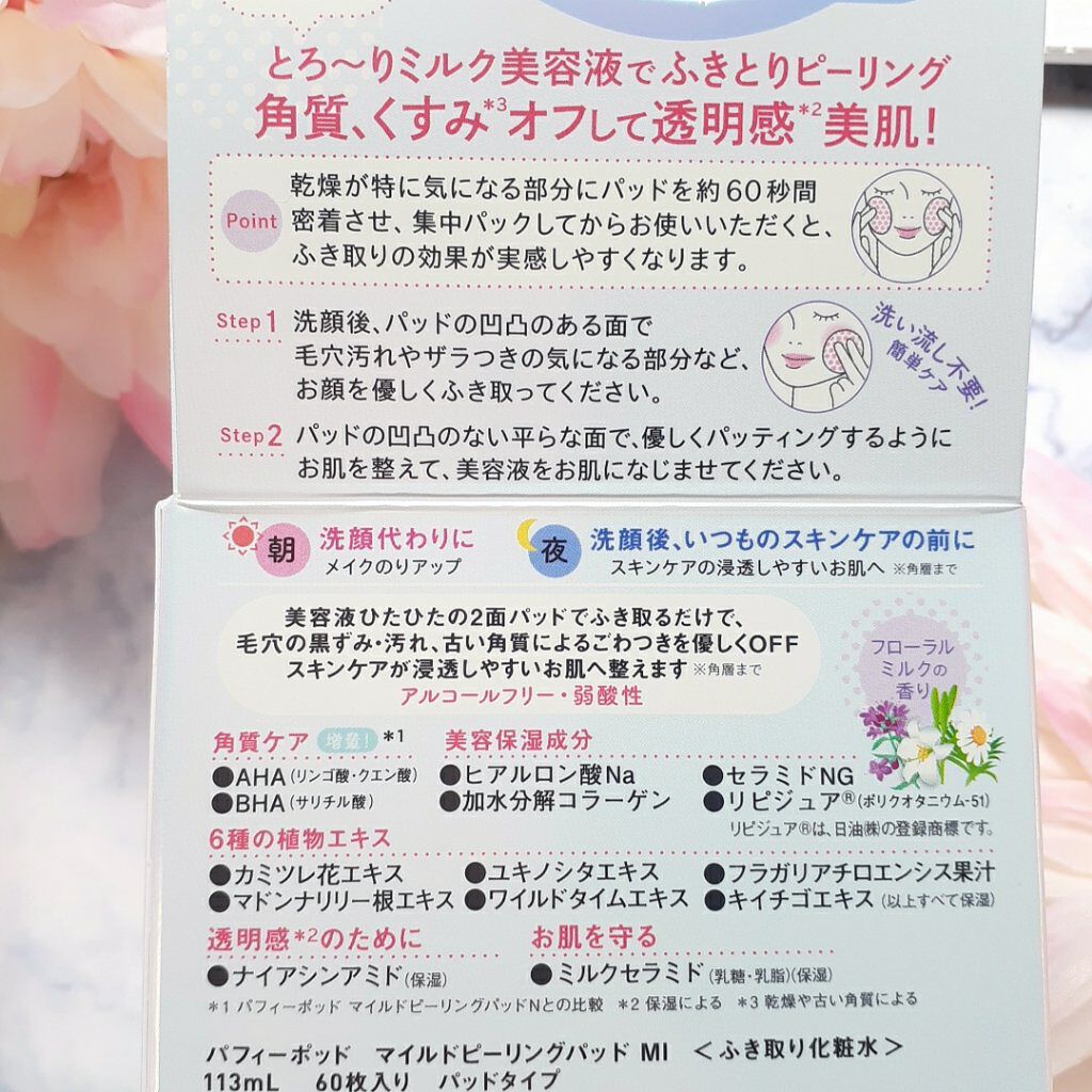 - AHA・BHA*を増量!*1 とろりミルク美容液の角質ふきとりピーリングパッド。 ざらつく古い角質OFF・くすみ*3オフして透明感*2アップ・集中パックで潤いUP! 感想が気になる部分に約60秒間密着パックさせると、よりふき取り効果が実感できる! STEP1:洗顔後、凸凹面でふき取りケア! STEP2:フラット面でパッティングして美容液をなじませる! * AHA(リンゴ酸・クエン酸)&BHA(サリチル酸)(角質ケア) *1 パフィーポッド マイルドピーリングパッドNとの比較 *2 保湿による *3 乾燥や古い角質による
