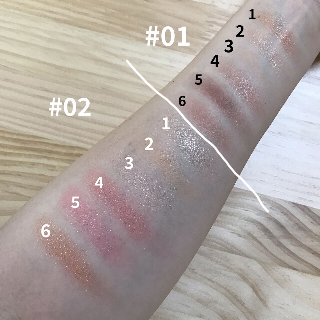 パケが可愛すぎる!高級感のあるパケ! 1000円以内というコスパ ラメが可愛い🥺 マットカラーのほんわか発色がきゅん。 01のマットカラー部分にゴールドラメが入っていて可愛い 01番の4のマーブルカラーと02番の01のラメがぼにょっとした質感でしっかり密着してくれる! 鏡付き!(画質悪めな感じはある。笑)