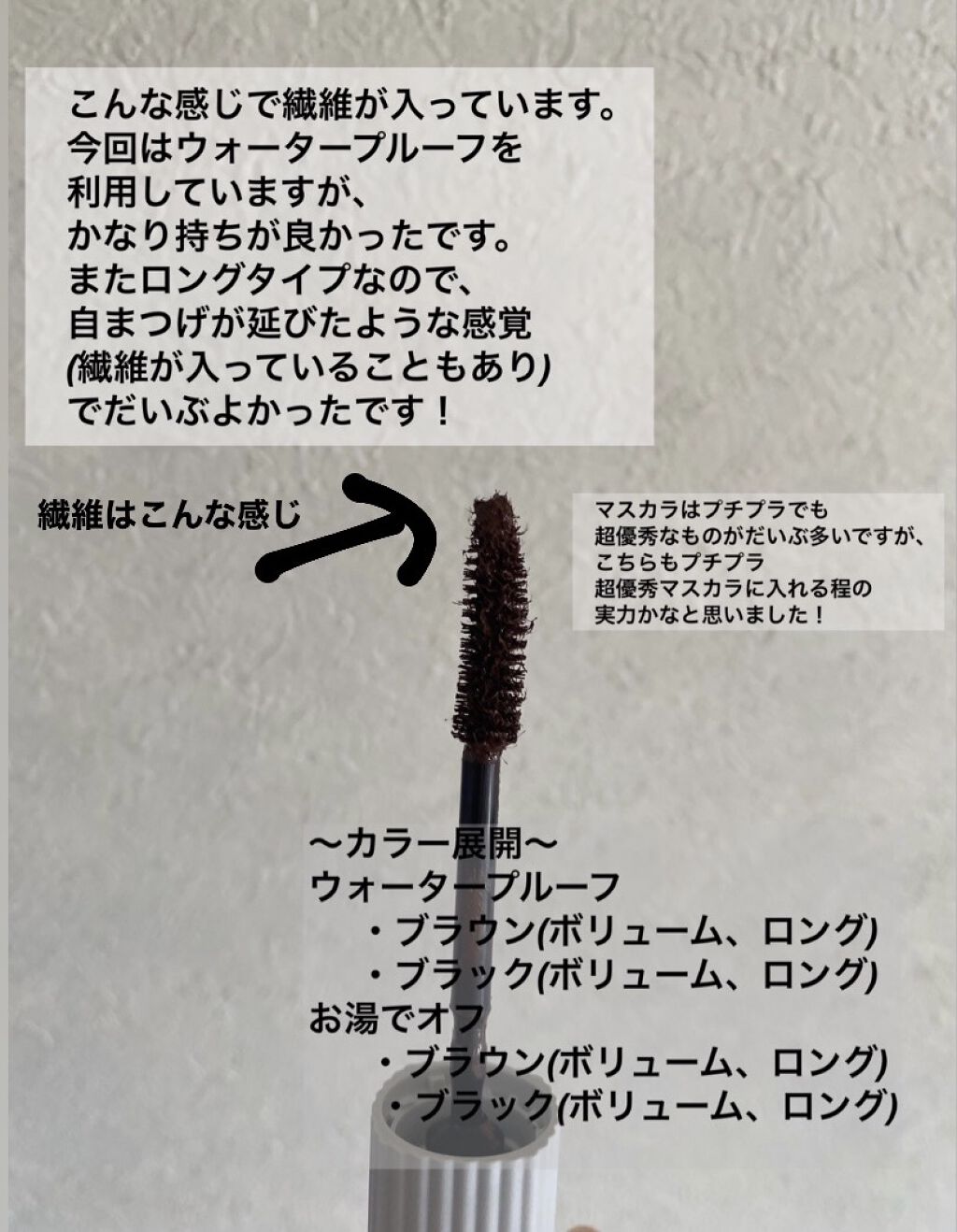 ファシオのウォータープルーフマスカラです👀 ブラシ部分は少し多めですが液がまつ毛にドバッとつきすぎてしまうこともほとんどなく繊細だけど存在感のあるまつ毛になります! ウルトラロングラッシュファイバー配合でいろんな長さの繊維が入っているおかげで自然にまつ毛が長くなったような仕上がりになるそうです👍 まつ毛を盛ってしっかり存在感を出したいけれど濃すぎるのは…という方にオススメです!
