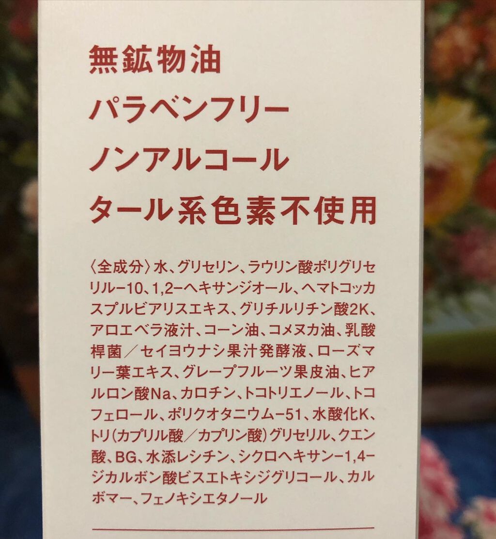 - 水、グリセリン、ラウリン酸ポリグリセリル-10、1,2-ヘキサンジオール、ヘマトコッカスプルビアリスエキス、グリチルリチン酸2K、アロエベラ液汁、コーン油、コメヌカ油、乳酸桿菌/セイヨウナシ果汁発酵液、ローズマリー葉エキス、グレープフルーツ果皮油、ヒアルロン酸Na、カロチン、トコトリエノール、トコフェロール、ポリクオタニウム-51、水酸化K、トリグリセリル、クエン酸、BG、水添レシチン、シクロヘキサン-1,4-ジカルボン酸ビスエトキシジグリコール、カルボマー、フェノキシエタノール