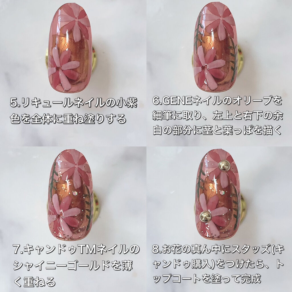 ワンカラーでも指ごとに色を変えるだけでオシャレに見えます💕 画像のようにゴールドラインとストーンを少し足すだけで華やかさがアップ🥰 何度かご紹介したことのあるスポンジで作るグラデーションです✨ スポンジを使うことで境目が綺麗に馴染んでくれます💕 アルミホイルの上でブラウンとトップコートを1:1くらいで混ぜたものを、トップコートのハケに取って3箇所に塗るだけ👌 事前に混ぜたものを塗ることで、爪の上でぼかすより簡単に出来ます💕 ベースカラーが乾く前に点置きしてぼかすことで綺麗にぼかせます✨ スピードが大事なので、使うポリッシュのキャップは全て開けておきましょう😊 天然石のラインはガタガタの方がより天然石っぽく見えるので、ラインを描くのが苦手な方でも大丈夫🙆♀️ 難しそうに見えて、やってみると意外と簡単に出来ます♡