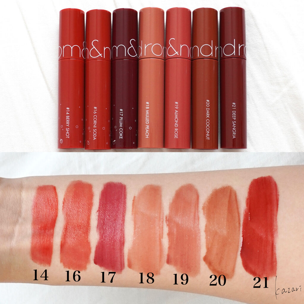 rom&ndジューシーラスティングティント#18MULLEDPEACH#19ALMANDROSE#20DARKCOCONUT#21DEEPSANGRIA去年の秋頃に出ていたrom&ndの新作4色をようやく購入したのでレビューします🌟私はLOF...