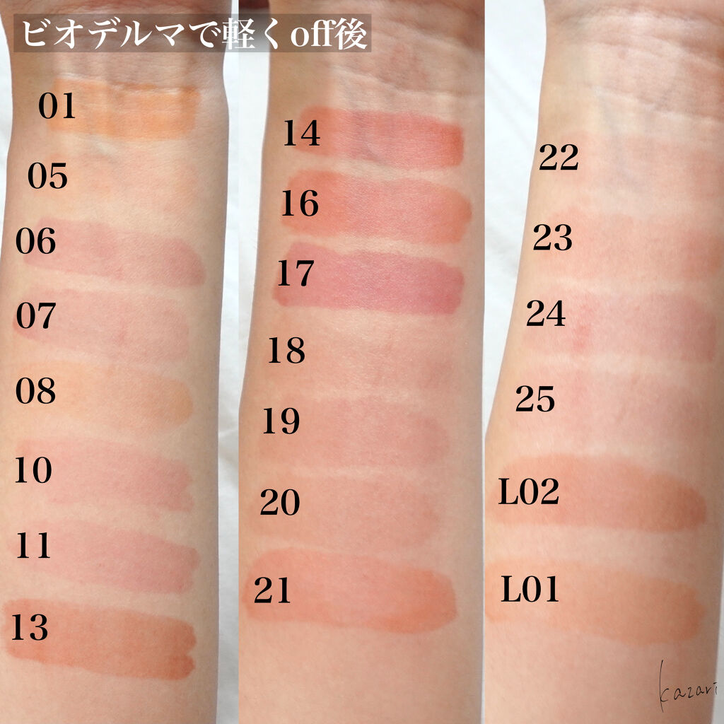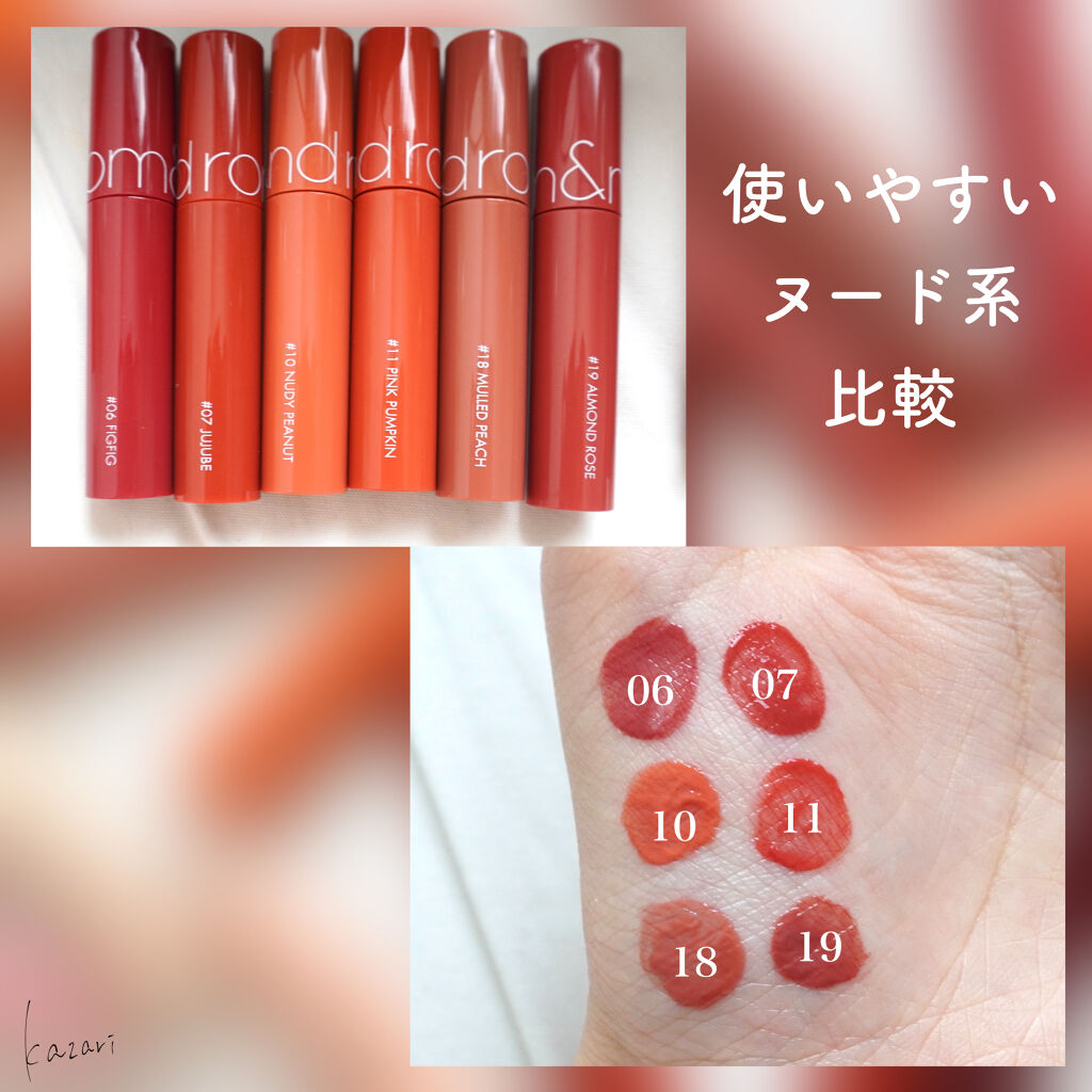 rom&ndのティントはフレッシュなオレンジは数が少なく定番だと01番だけ(だと思います) 深みのあるオレンジやオレンジブラウン系になると一気に色が増える!! 濃いめの発色は13,20あたりで08のアップルブラウンは濃すぎず比較的使いやすい色味だと思います👌 使いやすいヌードよりの色味が一気に増えたrom&nd もともとFIGFIGやJUJUBEが使いやすい!と人気でしたが、新色が増えてよりヌードなカラーが増えました👏 1番ベージュ系に近いのは新作の22,23あたり FIGFIGとJUJUBEをよりイマドキの色に仕上げたのが18,19あたりになります 個人的に好きなのは10,11あたりです 使いやすいし血色感もほどよくでる🌟 パッケージがその色になってるので結構どんな色か分かりやすいrom&nd 比較するとこれよりは赤いのかとか薄いのかなど分かるので参考にしてみて下さい🙌