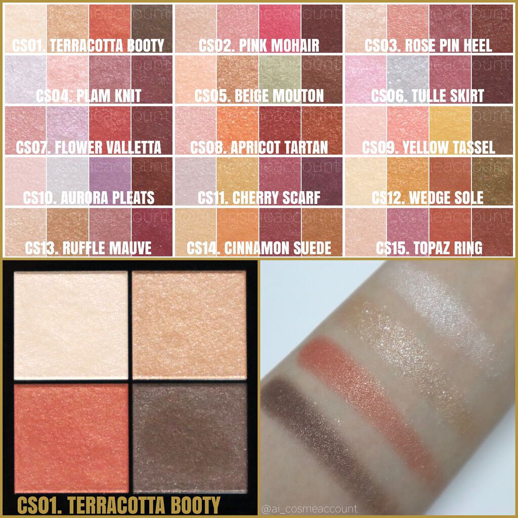 - <CS01-CS05共通> トリエチルヘキサノイン、 リンゴ酸ジイソステアリル、 メタクリル酸メチルクロスポリマー、 イソステアリン酸水添ヒマシ油、 ラウリン酸亜鉛、 スクワラン、 トコフェロール、 メチルパラベン、 (+/-) グンジョウ、 コンジョウ、 タルク、 ホウケイ酸(Ca/Al)、 マイカ、 金、 銀、 酸化チタン、 酸化鉄、 水酸化Al、 赤202、 赤226 <CS07> トリエチルヘキサノイン、 リンゴ酸ジイソステアリル、 メタクリル酸メチルクロスポリマー、 イソステアリン酸水添ヒマシ油、 ラウリン酸亜鉛、 スクワラン、 トコフェロール、 メチルパラベン、 グンジョウ、 タルク、 ホウケイ酸(Ca/Al)、 マイカ、 金、 銀、 酸化チタン、 酸化鉄、 赤202、 赤226 <CS09> トリエチルヘキサノイン、リンゴ酸ジイソステアリル、メタクリル酸メチルクロスポリマー、イソステアリン酸水添ヒマシ油、ラウリン酸亜鉛、スクワラン、トコフェロール、メチルパラベン、(+/-)グンジョウ、コンジョウ、タルク、ホウケイ酸(Ca/Al)、マイカ、金、銀、酸化チタン、酸化鉄、赤202、赤226 <CS10> トリエチルヘキサノイン、リンゴ酸ジイソステアリル、メタクリル酸メチルクロスポリマー、イソステアリン酸水添ヒマシ油、ラウリン酸亜鉛、スクワラン、トコフェロール、メチルパラベン、(+/-)グンジョウ、コンジョウ、タルク、ホウケイ酸(Ca/Al)、マイカ、金、銀、酸化チタン、酸化鉄、赤202、赤226 <CS11> トリエチルヘキサノイン、リンゴ酸ジイソステアリル、メタクリル酸メチルクロスポリマー、イソステアリン酸水添ヒマシ油、ラウリン酸亜鉛、スクワラン、トコフェロール、メチルパラベン、グンジョウ、シリカ、タルク、ホウケイ酸(Ca/Al)、マイカ、金、銀、酸化スズ、酸化チタン、酸化鉄、赤226 <CS14> トリエチルヘキサノイン、 リンゴ酸ジイソステアリル、 メタクリル酸メチルクロスポリマー、 イソステアリン酸水添ヒマシ油、 ラウリン酸亜鉛、 スクワラン、 トコフェロール、 メチルパラベン、 グンジョウ、 シリカ、 タルク、 ホウケイ酸(Ca/Al)、 マイカ、 金、 銀、 酸化スズ、 酸化チタン、 酸化鉄、 赤202、 赤226 <CS16> トリエチルヘキサノイン、リンゴ酸ジイソステアリル、メタクリル酸メチルクロスポリマー、イソステアリン酸水添ヒマシ油、ラウリン酸亜鉛、スクワラン、トコフェロール、メチルパラベン、タルク、ホウケイ酸(Ca/Al)、マイカ、金、銀、酸化チタン、酸化鉄、赤202、赤226 <CX01-CX06共通> トリエチルヘキサノイン、リンゴ酸ジイソステアリル、イソステアリン酸水添ヒマシ油、ラウリン酸亜鉛、ポリグリセリル-3ポリジメチルシロキシエチルジメチコン、スクワラン、トコフェロール、酢酸セルロース、メチルパラベン、(+/-)グンジョウ、シリカ、タルク、ホウケイ酸(Ca/Al)、マイカ、金、銀、酸化スズ、酸化チタン、酸化鉄、水酸化Al、赤202、赤226 <CX07> トリエチルヘキサノイン、リンゴ酸ジイソステアリル、イソステアリン酸水添ヒマシ油、ポリグリセリル-3ポリジメチルシロキシエチルジメチコン、ラウリン酸亜鉛、スクワラン、トコフェロール、酢酸セルロース、メチルパラベン、グンジョウ、タルク、ホウケイ酸(Ca/Al)、マイカ、金、銀、酸化チタン、酸化鉄、水酸化Al、赤202、赤226 <CX08> トリエチルヘキサノイン、リンゴ酸ジイソステアリル、イソステアリン酸水添ヒマシ油、ラウリン酸亜鉛、ポリグリセリル-3ポリジメチルシロキシエチルジメチコン、スクワラン、トコフェロール、酢酸セルロース、メチルパラベン、グンジョウ、シリカ、タルク、ホウケイ酸(Ca/Al)、マイカ、金、銀、酸化スズ、酸化チタン、酸化鉄、水酸化Al、赤226