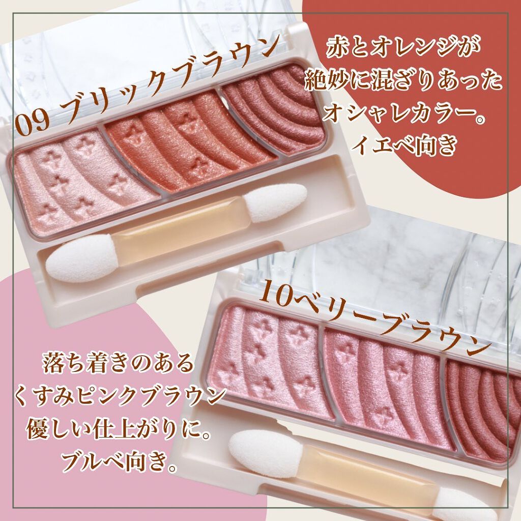 01 ナチュラルブラウン 1つは持っておきたいベーシックなベージュブラウンパレット イエローベースに◎ 06 オレンジカシス コントラストの効いた配色がおしゃれなオレンジ×カシスパレット イエローベースに◎ 09 ブリックブラウン こっくり深みのある大人なオレンジブラウンパレット 陰影のある目元が作れます イエベ秋に◎
