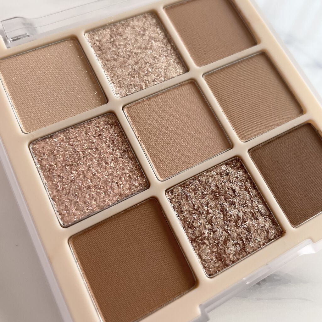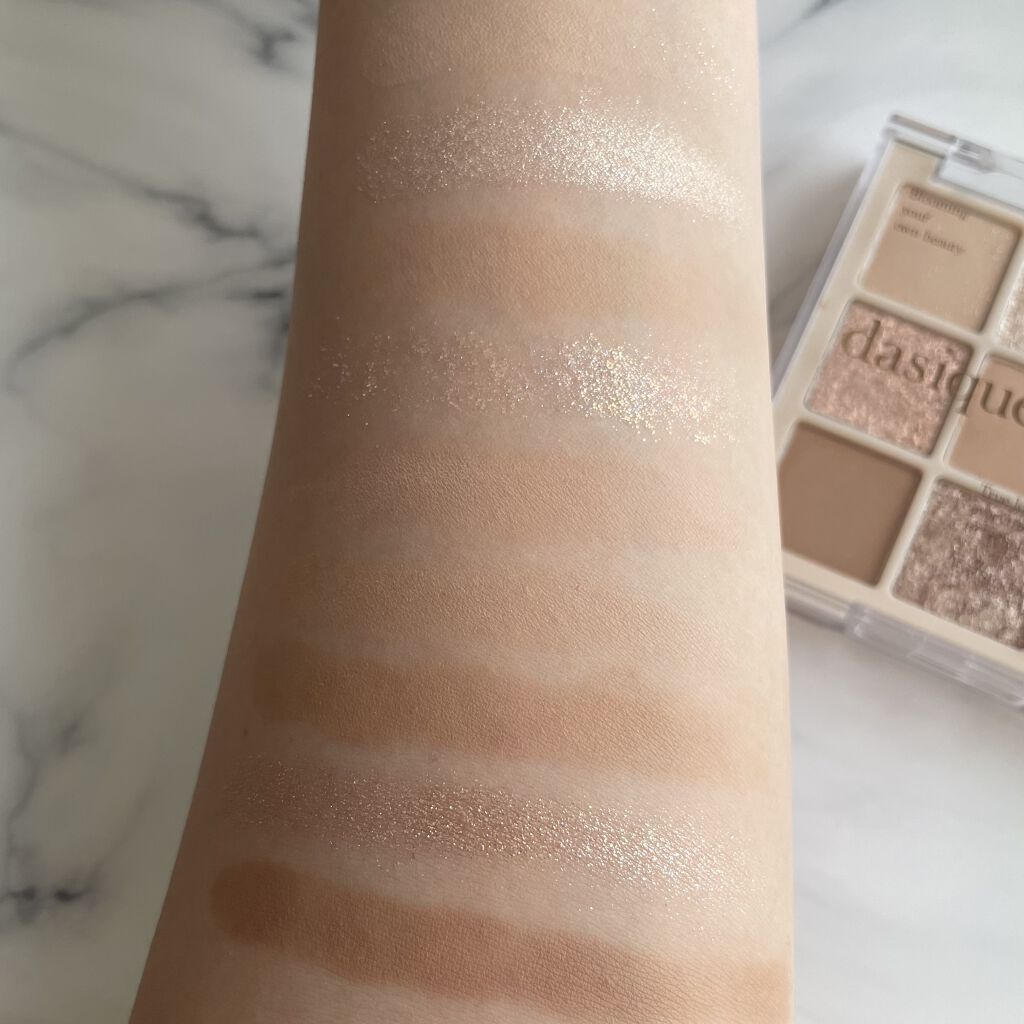 多彩な質感のカラーが集まったdasiqueの9色パレット🫶🏻 粉質も柔らかく、粉飛びもしにくい!なのにグリッター•ラメは密着力高くきらっきら💖 組み合わせも自由自在で思いのままにメイクができる万能パレット☺︎ 見た目も可愛いし、使い勝手もいいお気に入りのアイシャドウパレットです❤️🔥 07.Milk Latte 淡い発色。陰影メイクにぴったり☕️ 10.Autumn Breeze 落ち着いたムード🍂