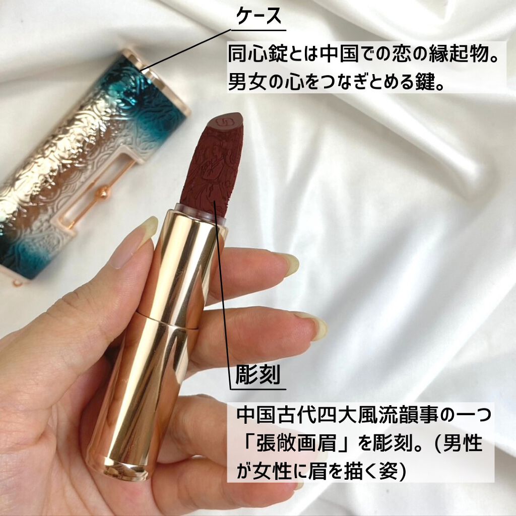 - ・伝統の彫刻技法を通じて、中国伝統のラブストーリーをスティック本体にて再現。二人の心を繋がる縁起物である「同心錠」をモチーフにした、花西子定番の彫刻リップ。特別なロマンを愛する人へ。 ・ほどよくしっとりした質感によるなめらかな付け心地と、こだわりの発色力がひと塗りで綺麗に発色し、気品のあるマットリップを叶える。 ・モクフヨウ、スノーフレーク、白花百合など肌にやさしい使い心地の植物由来保湿成分配合で、唇にうるおいを与える。