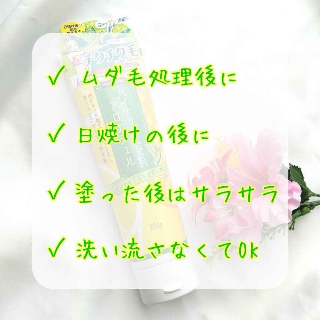 - チクチク毛パウダーインで目立たない!ムダ毛処理・日焼け後のボディジェル ムダ毛処理後のジョリジョリ肌・チクチク肌が気になる方に!パウダーインで毛穴が目立たない!ムダ毛処理後、日焼け後のボディケアジェルです。塗った後はお肌サラサラ!パイナップルエキス・豆乳エキス・アロエエキスの保湿成分配合で肌荒れを防ぎお肌に潤いを与えます。爽やかなパイナップルの香り付き。 (使い方) 腕や足など、入浴後の素肌になじませるようにしてご使用下さい。 ※洗い流し不要 ※ムダ毛処理後の継続してのご使用をおすすめします。