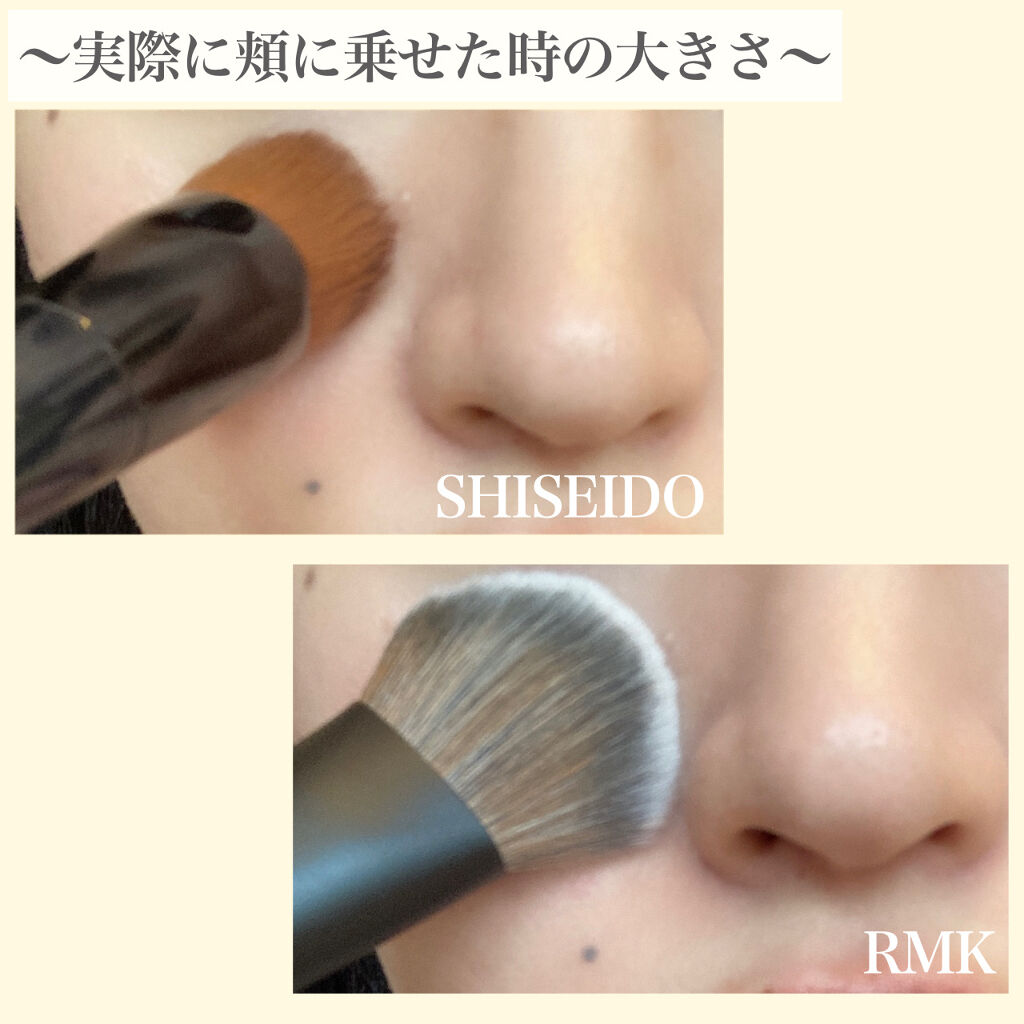 ブラシ部分は密集していて、斜めにカットされた形になっています。 小回りが効くので細かい部分にもフィットしやすく、初心者さんにもおすすめ◎ ピンポイントにファンデを塗って広げていくので、結構しっかりカバーしてくれます。 ケースも付いていて、サイズ自体もそこまで大きくないので持ち運びにも便利。 ふわふわで肌触りがとてもいいです♡ 扇状のブラシの形をしていて、割と広い範囲にファンデを塗ることが出来ます。 しっかりカバーすると言うよりはナチュラルな仕上がりになります。 毛質がふわふわなのでパウダーファンデとも相性が良さそう♥︎ ブラシの横幅が薄いので、立てて使うと小鼻などにもフィットします。 RMKはベースメイクも優秀なので、ブラシも当然優秀ですね👏🏻