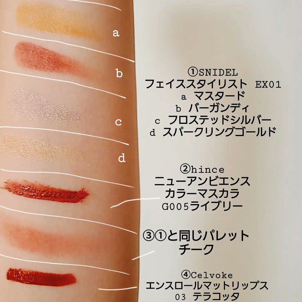 アイブロウは #WHOMEE のレッドブラウンを。 アイメイクは ①#hince の #ニューデップスアイシャドウ イニシャルを上下の瞼に馴染ませる。 ②#snidelbeauty の #フェイススタイリスト の a バーガンディを上瞼の際に 目尻から黒目上あたりまで。 b マスタードを同じく上瞼の際の目頭から 黒目上あたりまで。 c スパークリングゴールドを下瞼の黒目下に。 d フロステッドシルバーをcの両隣に✨ リップとチークは ④#rmsbeauty の #ラプチャー を唇にポンポン塗りにする。 指で馴染ませたら、指についてる残りを頬にも♡ ヘアスタイルは ちょっと変化を付けたくて 少しコテを使って ウルフっぽい形に。 アルジェランの ヘアバームとヘアオイルをほんの少し MIXしてスタイリング💆 #アルジェランヘアバーム → 9/11発売! #モイストグローヘアオイル →既に発売されているもの アウトバスだけでなくスタイリングにも オススメです🙆