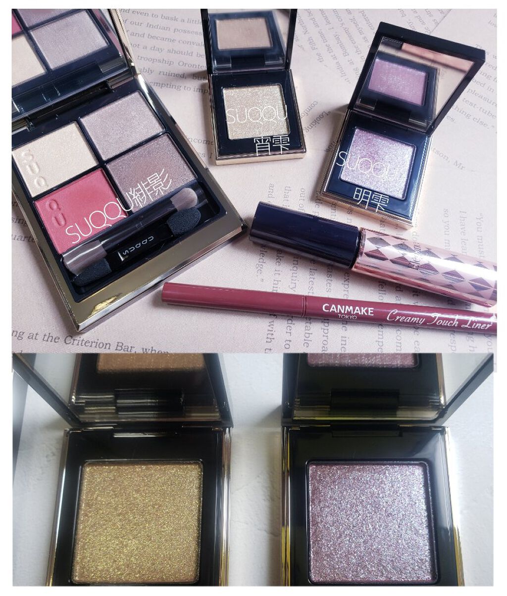 緋影は、右上アイホール左下二重幅+下まぶた 明雫は、下まぶた 宵雫は、目頭と黒目上 これめちゃくちゃ可愛いです!顔に秋が来てたまらんです!! 明雫と宵雫のたっぷりラメをとてもよく生かせてると思う(自画自賛メイク)限定なのほんともったいない体操。