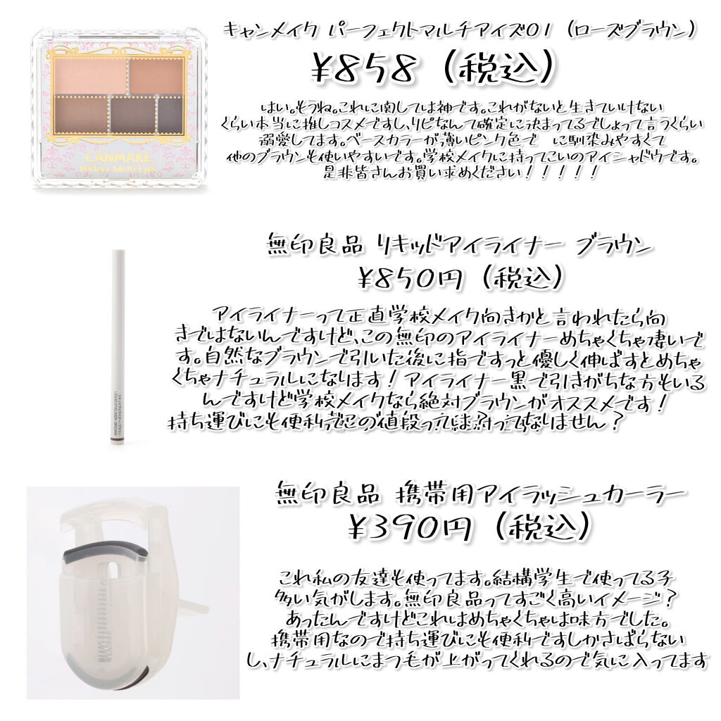 ガチのガチで毎日使っているものなので夏休み明け少しでも可愛くなりたい?方々の参考になったら嬉しいです。 一応校則が厳しい学校に通いながら自分でも模索してる途中なのでこれからどんどん変わると思いますが1年間このメイクで何も言われなかったです。 需要が無いかもしれませんがオススメのものも沢山あるので是非見ていただけると嬉しいです!