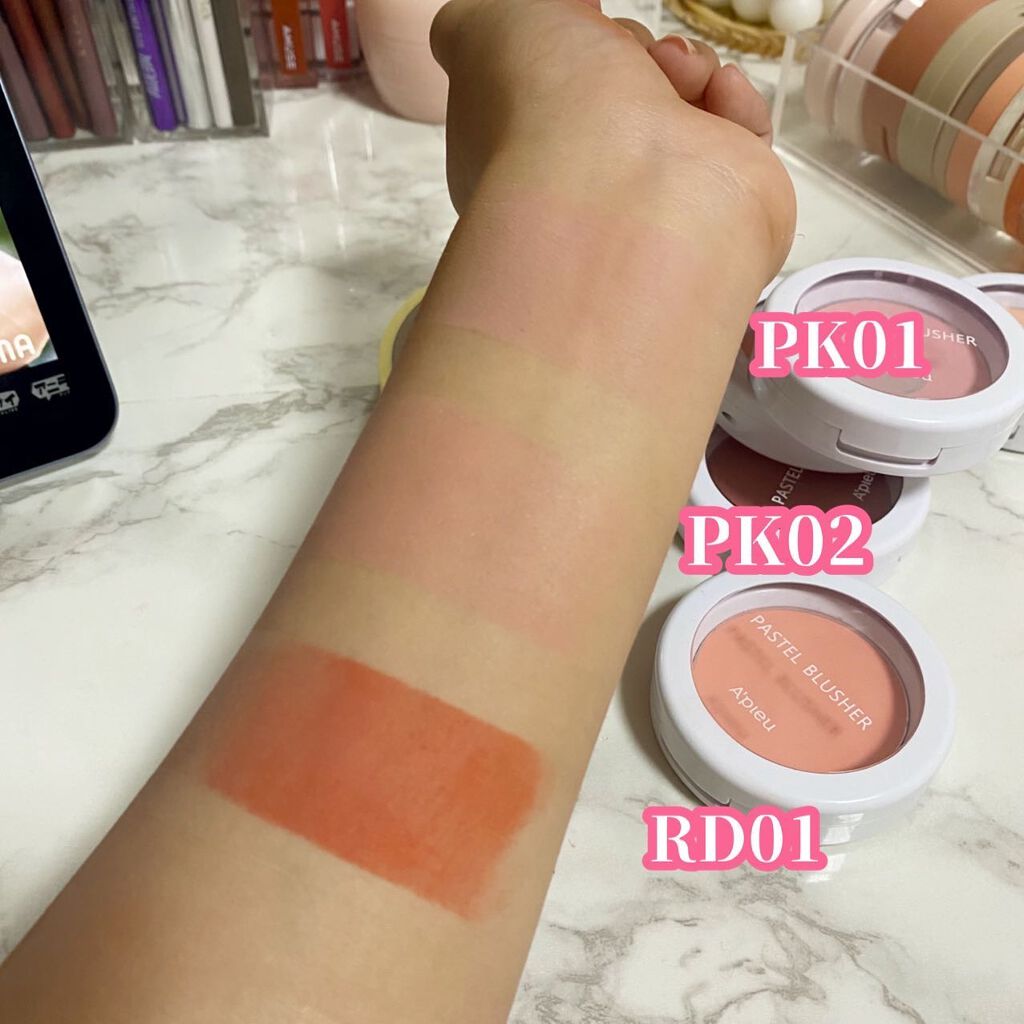 A’pieuアピューパステルブラッシャー PK11リボンコットンVL01ライラックコットンパケが新しくなって発売されたらしい!マットチークで毛穴ブラー効果高い!色がとっても可愛い😻ブラシで取ると粉含みかなり良いのに濃く発色せず自然な血色感が出...