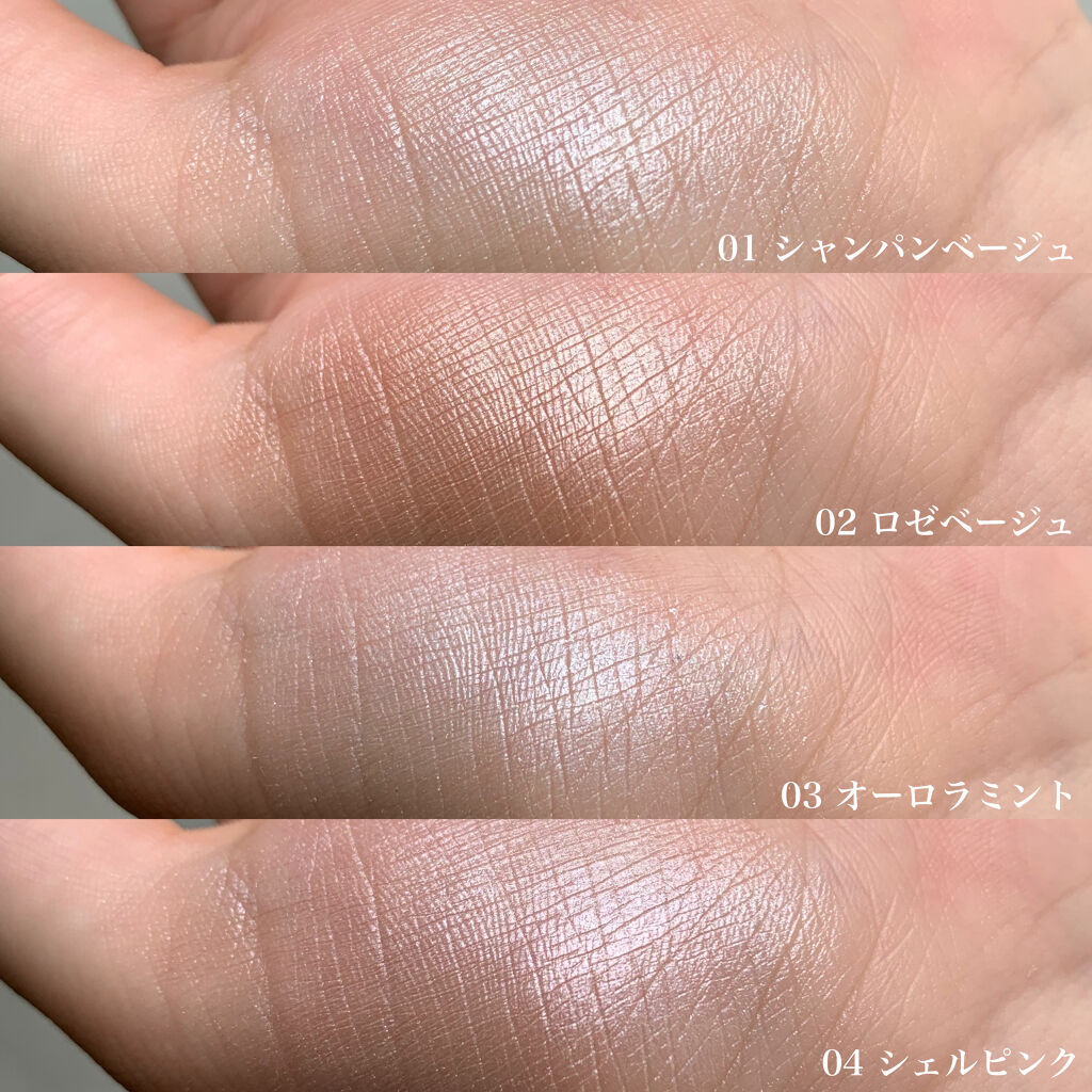 プチプラだとは思えないほどキラキラする綺麗なハイライト。ひとつ持っていて損はありません! オーロラミントは、肌につけると緑感はあまりなくて、透明感を出しながら発光してくれます。 シェルピンクはナチュラルに血色感も出しつつ馴染むカラーです