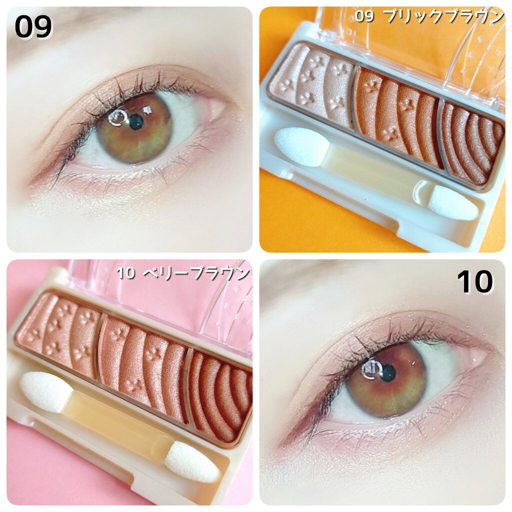 - 3色で簡単に明るく大きな目元に。 しっとり感触のアイシャドウ。 くすみを飛ばす明るさベース、ひとえ・奥二重の方でも幅広く塗れる肌なじみの良い中間色、 濃密高発色の締め色が目の輪郭を強調し大きな目元に。 微細パール配合でくすみを飛ばし、明るい目元へ。