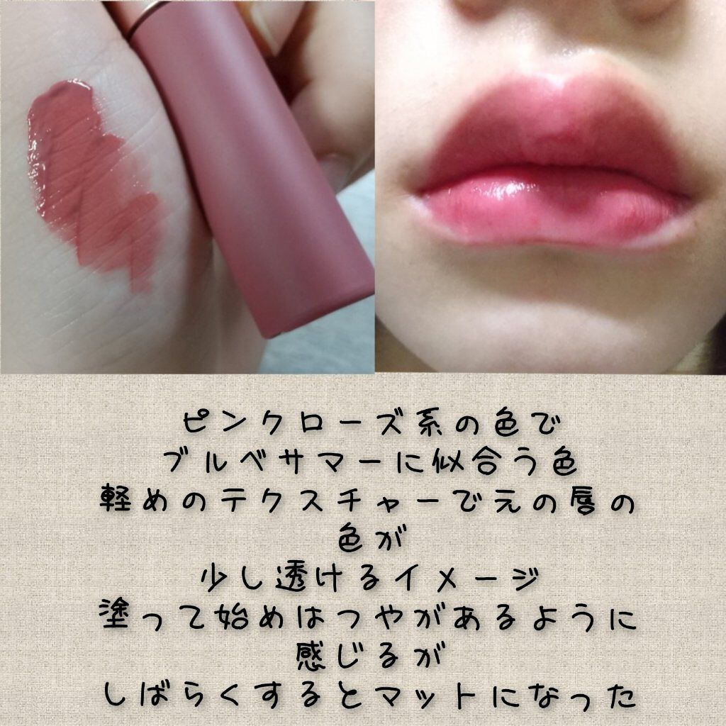 【使った商品】ミゼルエディ ウォータリーリップティントマット03 ローズピンク【色味】ブルベサマーに似合うブライトローズなカラー【色もち】ティントだけどあまり唇に色が残らなかった落ち方が綺麗だった【質感】軽めテクスチャーでティントが苦手な人で...