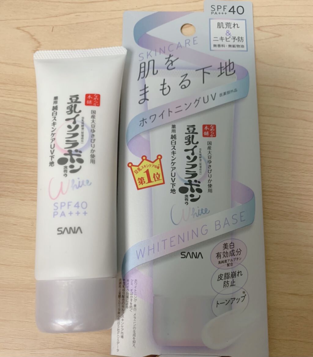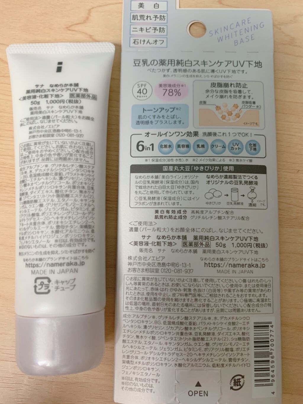 - <薬用美白スキンケアUV下地> 豆乳の美白スキンケアUV下地。肌荒れ&ニキビ予防しながら美白!メラニンの生成を抑え、シミ・そばかすを防ぎます。トーンアップ(メイク効果による)&皮脂崩れ防止。化粧水・美容液・乳液・クリーム・UVカット・化粧下地の1本6役。SPF40・PA+++。[販売名:サナ なめらか本舗 薬用美白スキンケアUV下地]