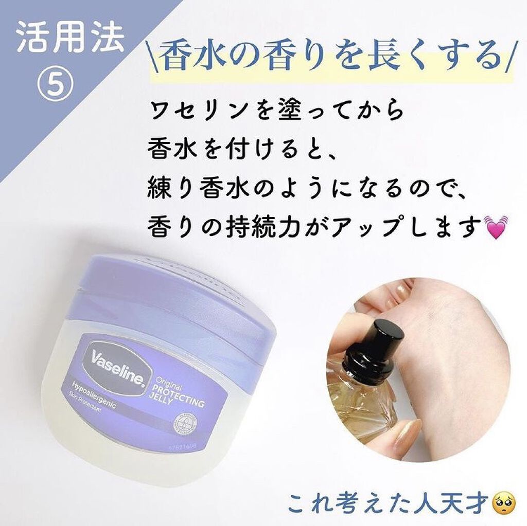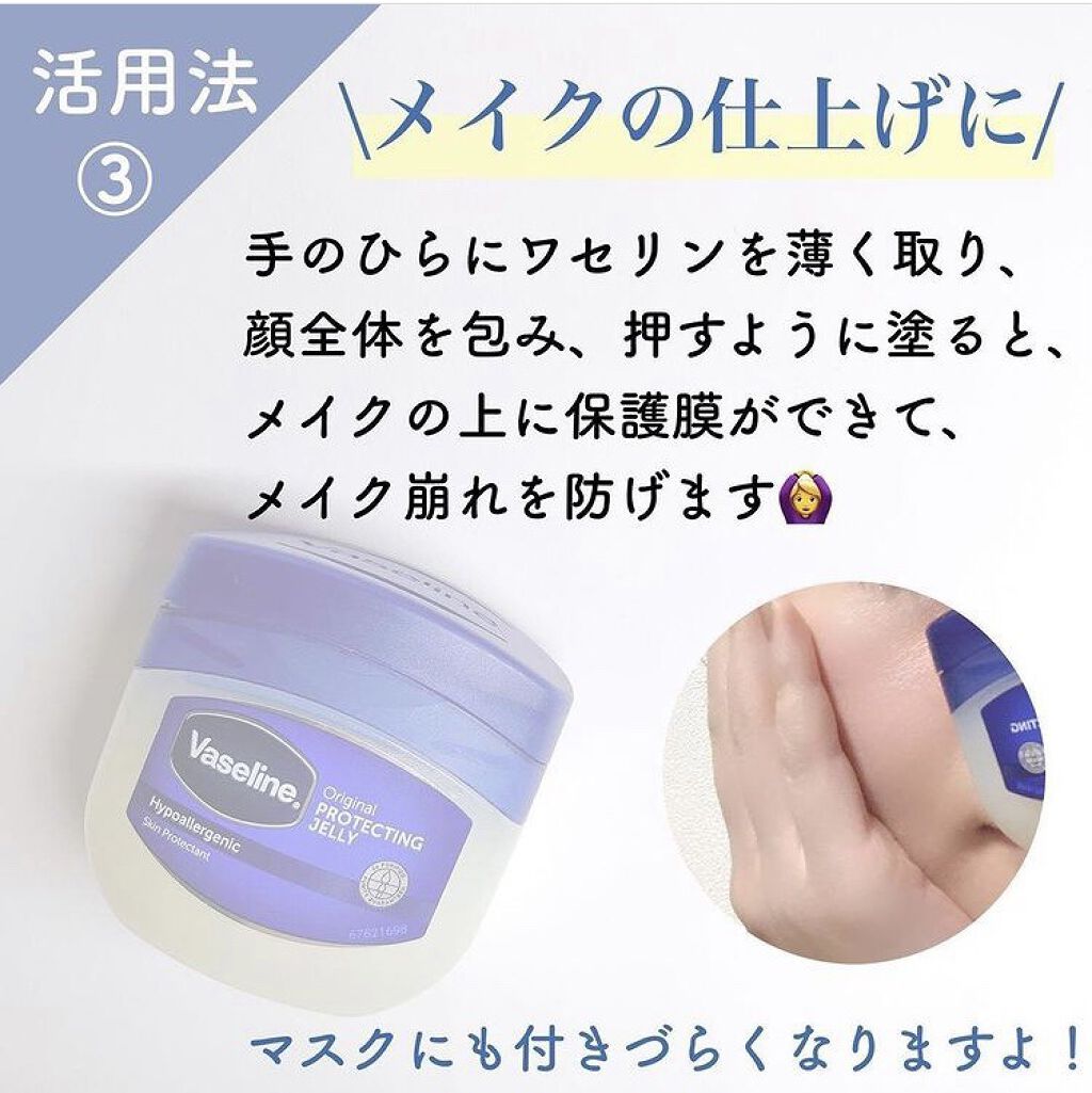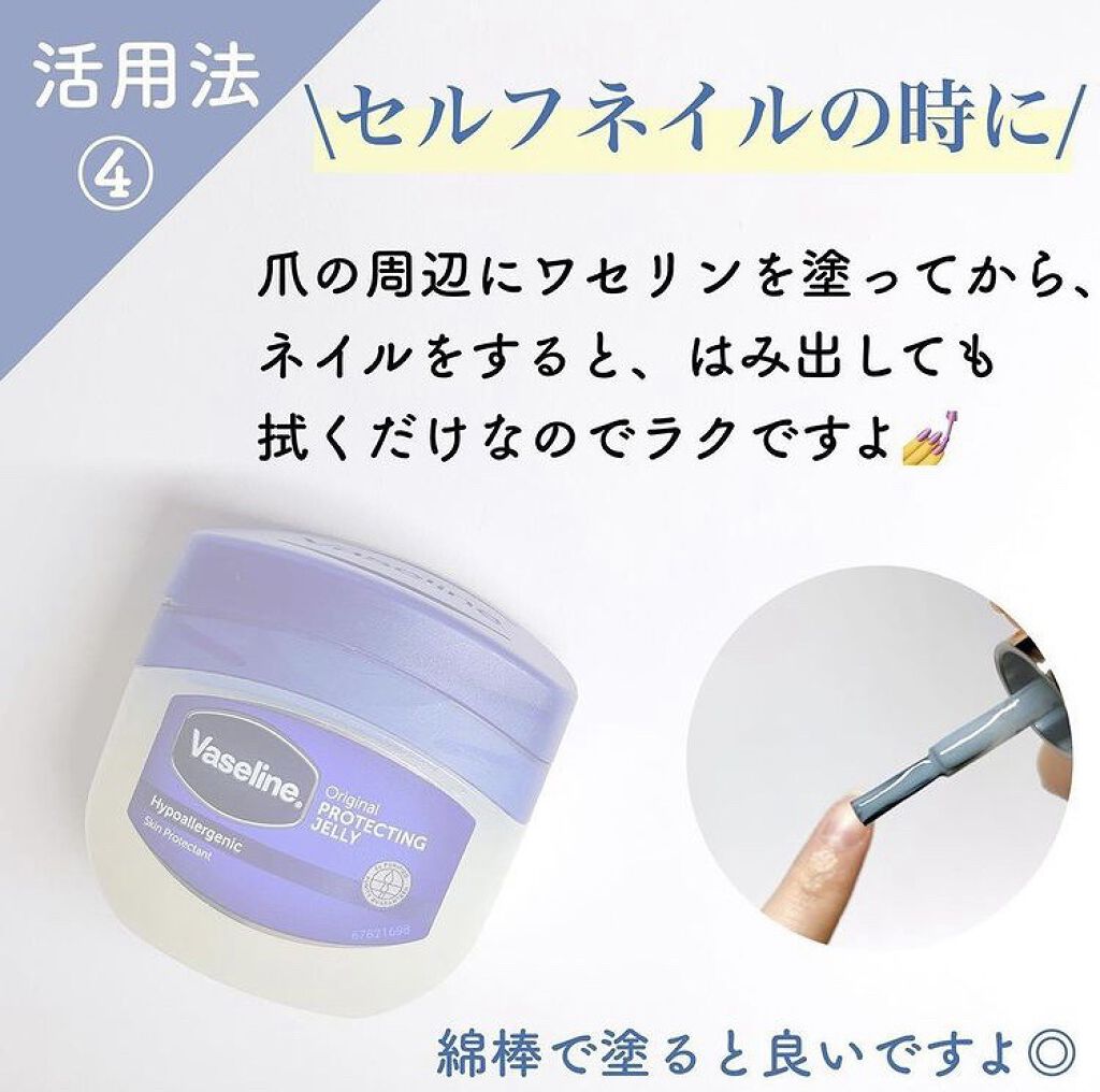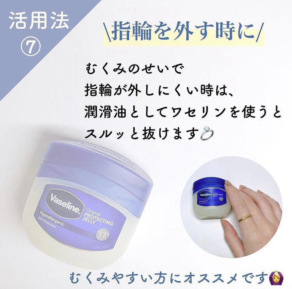 ①ワセリン、綿棒、タオル、ラップを用意します ②鼻にワセリンをたっぷり塗り、上からラップを被せ、ホットタオルで温めます ③15分たったら綿棒でくるくる角栓を絡めとります(めちゃとれる🤣) ワセリンを毛先中心に塗れば、静電気でバチバチしたり、広がったりしません!まとまりのある髪に✨ 手のひらにワセリンを薄く取り顔全体に包み込み、押すように塗るとメイクの上に保護膜ができて、メイク崩れを防げます🙆♀️ 爪の周辺にワセリンを塗ってからネイルをすると、はみ出しても拭くだけなのでラクですよ💅 ワセリンを塗ってから香水をつけると、練り香水のようになるので香りの持続力がアップします 鼻の入り口に、ワセリンを塗ることで、花粉の侵入をブロックします! むくみのせいで指輪が外しにくいときは、潤滑油としてワセリンを使うとスルッと抜けます💍