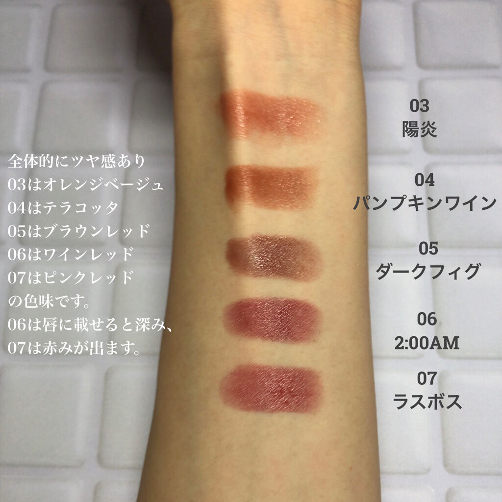 使ってみるとこれだけバズっている理由が分かります。確実にデパコスクオリティです。 まだまだ争奪戦が続いていてほとんど店舗で見かけることがないので、早く落ち着いて欲しいです。 03 陽炎 04 パンプキンワイン 05 ダークフィグ 06 2:00AM 07 ラスボス