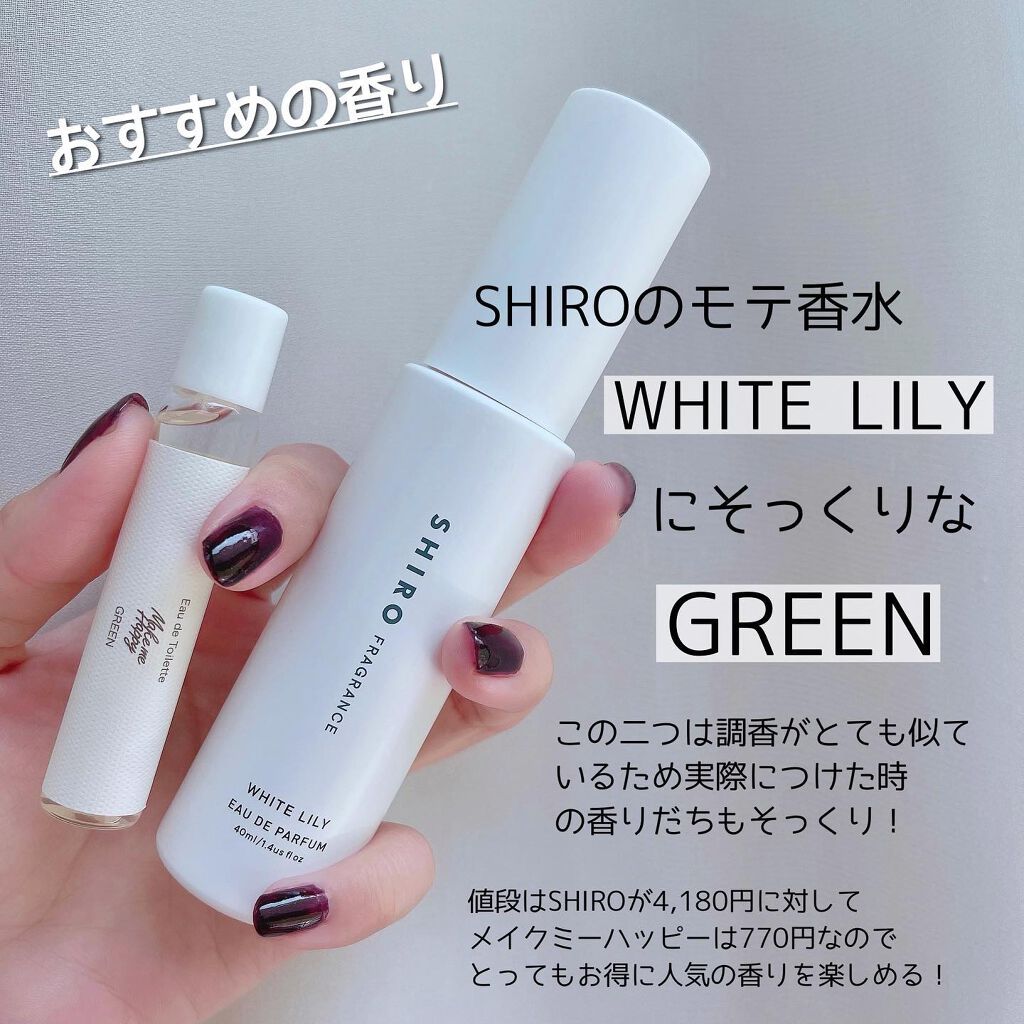 つける量を調整しやすい、ロールオンタイプのオードトワレです。 持ち運びにも便利なサイズ! 正直、「これはちょっと…」っと思うような、きつすぎる香りはなく(個人の意見です笑)、ふわっと香る良い香りがたくさんありました。 メイクミーハッピー オードトワレ WHITE ~白い花束をイメージした柔らかい香り~ 💬柔らかいフローラルの香りで、上品です