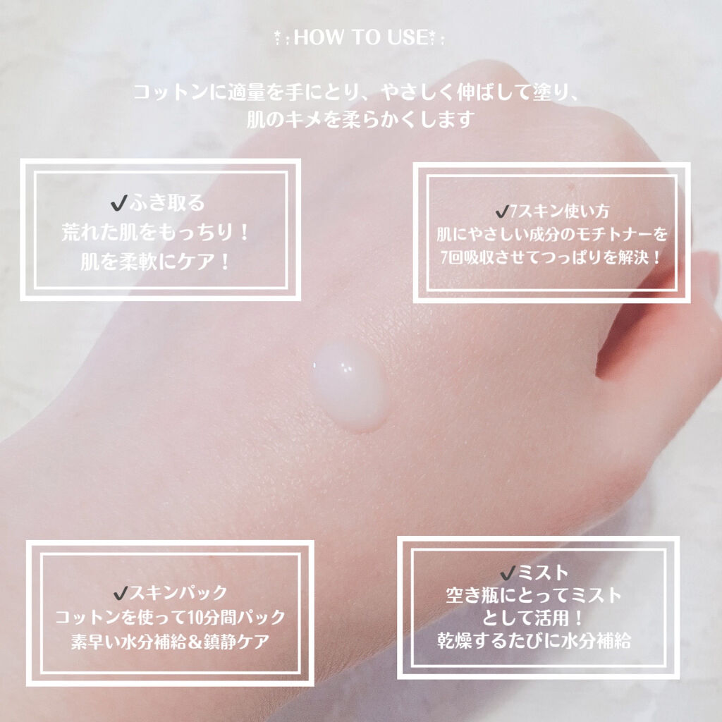 - 韓国で180万本突破の大人気化粧水 洗顔の後、適量を手やコットンに取り、顔全体によく馴染ませてください。 コットンに含ませて、ふき取り化粧水、パックとしてもご使用いただけます。 全身の保湿ケアとしてもおススメです。