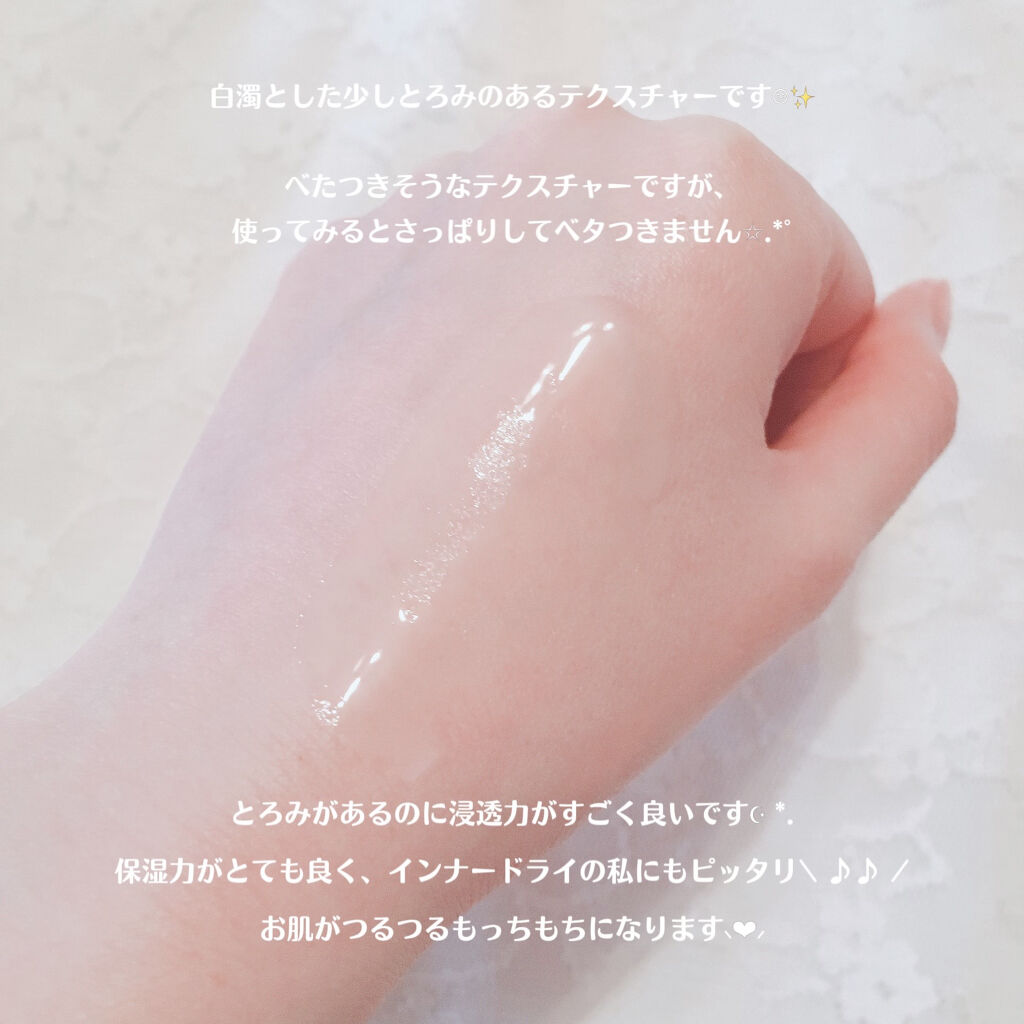 | 白濁したとろみのあるテクスチャーで、すっと肌になじんでしっとりする使用感です | 詳細を見る |