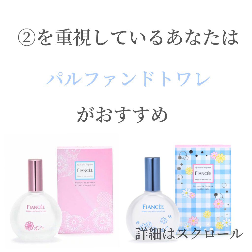 フィアンセ ボディミストがおすすめ👀値段⌇1320円内容量⌇50㎖なぜおすすめ?⌇優しく清潔感がある匂いとなっていて、学校でもこっそり使うことが出来るから。匂いは男ウケ間違いなしなので、学校でつけていきましょう! フィアンセ パルファンドトワレがおすすめ👀値段⌇1980円内容量⌇50㎖なぜおすすめ?⌇「ボディミストと同じじゃんか、値段が高いだけ?」と思ってる人、違います!匂いはボディミストと同じだけど、持続性が高いんです!長く続くのでつけ直さなくて🙆🏻外出の際はもちろん、就寝前やファブリックミストとして使うのもおすすめなんです! フィアンセ ジェルフレグランスがおすすめ👀値段⌇880円内容量⌇9gなぜおすすめ?⌇ちっっっさい(そんなに小さくない)ので持ち運びにすんごく便利で、ボディミストの量少ない版みたいなので、ボディミストのお試しとしても🙆🏻