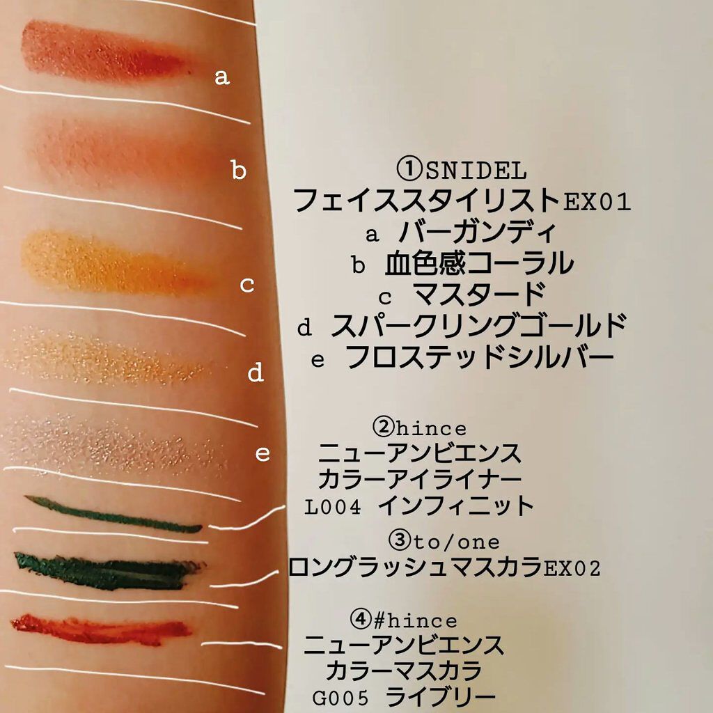 アイブロウは#whomeeのレッドブラウンを使用。 アイメイクは①#アンドビーの#クリームアイシャドウ マスタードを上下の瞼に。 アイメイクは②#misshaの#グリッタープリズムシャドウマーブル #ストームプリズムを①に重ねて。 下瞼は全体ではなく、黒目下にだけ✨ アイメイクは③#hinceの#ニューアンビエンスカラーアイライナー #エクレクティックを4枚目のように三角形に入れる。 チークは⑤#bisouの#ダイヤモンドグロウ マーズをほんのり✨ リップは⑥①のマスタードを塗った後に#celvokeの#エンスロールマットリップス 03を💋