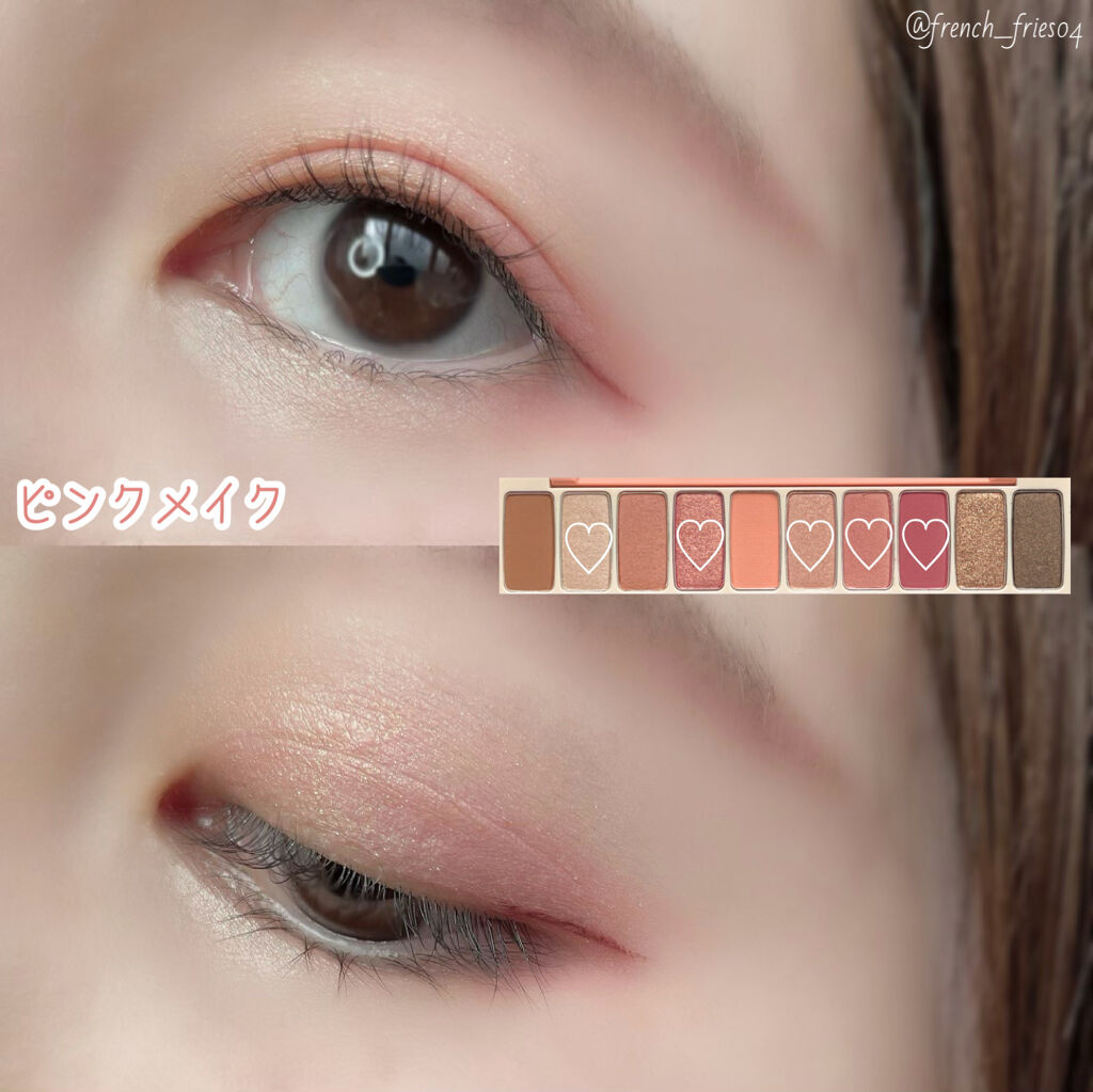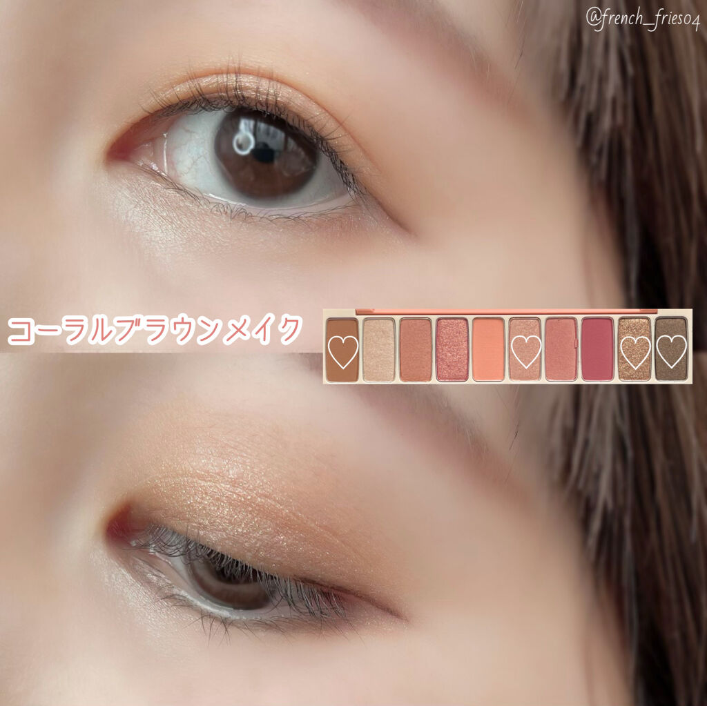 - 肌なじみの良い、鮮やかな発色で目元を華やかに彩る捨て色なしの10色アイシャドウパレット 異なる3種のテクスチャーを自由に組み合わせて、グラデーションも思いのままに。 NEW 2023.4 ・肌トーンにあう配色を詰め込んだトレンドカラー 肌トーンに合わせて、自分に似合うトレンドカラーが楽しめる♡ パーソナルカラー×トレンドカラーの掛け合わせパレットで、デイリーメイクもスペシャルメイクも気分にあわせてなりたい自分に! ・むにゅっとジェル質感ラメで高密着、煌めく目元 パレットの中でもポイントとなる大きめ粒子のラメは、ジェルのような新質感で落ちにくく肌にぴったりと密着します。キラキラとした目元をキープします。 ・使うカラーは大きめに!リアル捨て色なしパレット ベースやラメのよく使うカラーと締め色や濃い色等の減りが少ないカラーを異なるサイズで詰め込んだ、リアル捨て色なしパレット! <使用方法> 付属のデュアルシャドウブラシでベースカラーをまぶた全体に塗り広げます。細いブラシでグラデーションや目尻、アイライン、涙袋などのポイントカラーをのせて仕上げます。