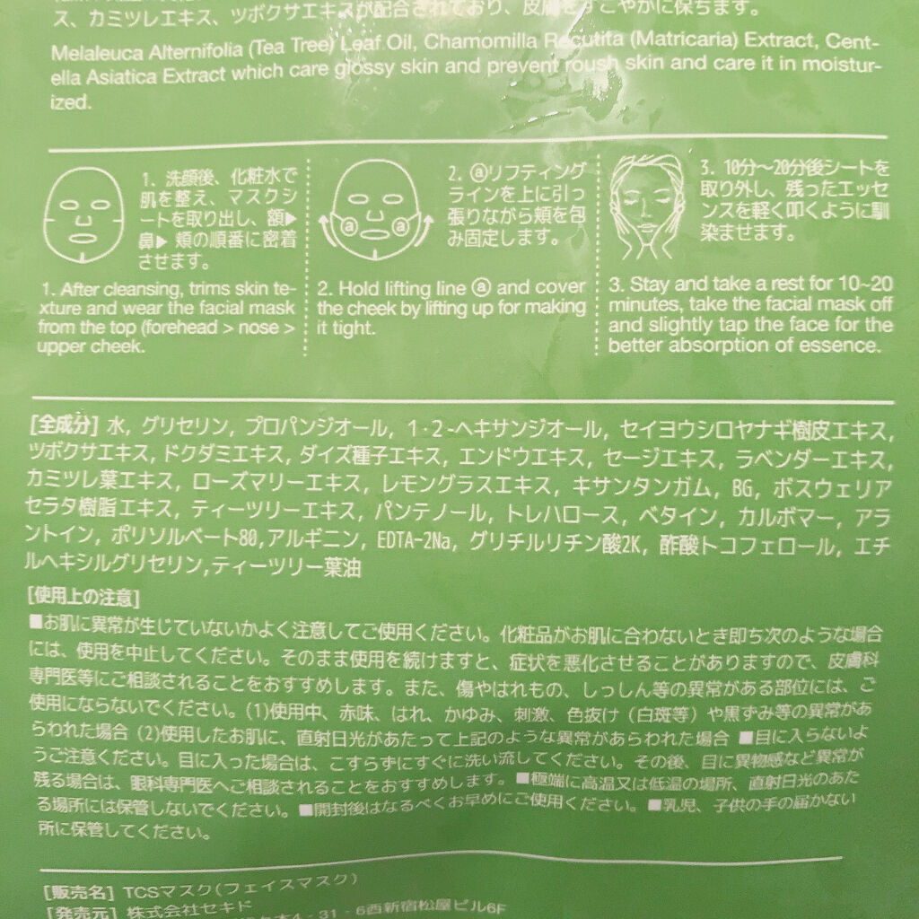 - <25ml×3枚> 水、プロパンジオール、グリセリン、BG、1,2-ヘキサンジオール、セイヨウシロヤナギ樹皮エキス、キサンタンガム、パンテノール、トレハロース、ベタイン、ポリソルベート80、カルボマー、アルギニン、アラントイン、EDTA-2Na、ティーツリー葉エキス、酢酸トコフェロール、グリチルリチン酸2K、ティーツリー葉油、ボスウェリアセラタ樹脂エキス、エチルヘキシルグリセリン、レモングラスエキス、エンドウエキス、ドクダミエキス、セージエキス、ツボクサエキス、カミツレエキス、ローズマリーエキス、ラベンダーエキス、ダイズ種子エキス <25ml×1枚> 水、プロパンジオール、グリセリン、BG、1,2-ヘキサンジオール、セイヨウシロヤナギ樹皮エキス、キサンタンガム、パンテノール、トレハロース、ベタイン、ポリソルベート80、カルボマー、アルギニン、アラントイン、EDTA-2Na、ティーツリー葉エキス、酢酸トコフェロール、グリチルリチン酸2K、ティーツリー葉油、ボスウェリアセラタ樹脂エキス、エチルヘキシルグリセリン、レモングラスエキス、エンドウエキス、ドクダミエキス、セージエキス、ツボクサエキス、カミツレエキス、ローズマリーエキス、ラベンダーエキス、ダイズ種子エキス