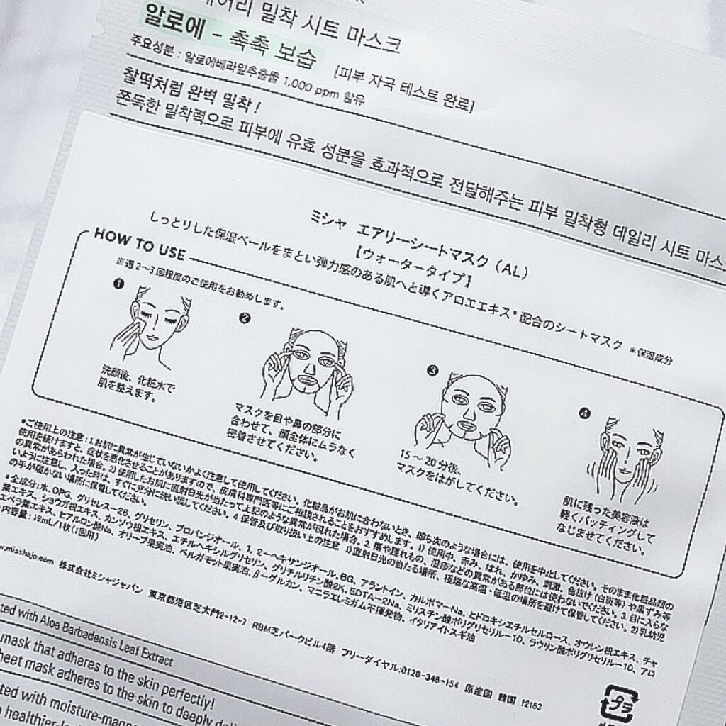 MISSHA エアリーシートマスク。種類はティーツリー。スーッとするハーブ系のような香りがします。美容液は透明でとろとろとシャバシャバ系の中間のようなテクスチャーです。たたまれているのを広げる時に少し時間がかかるぐらい薄くてとても柔らかなシー...