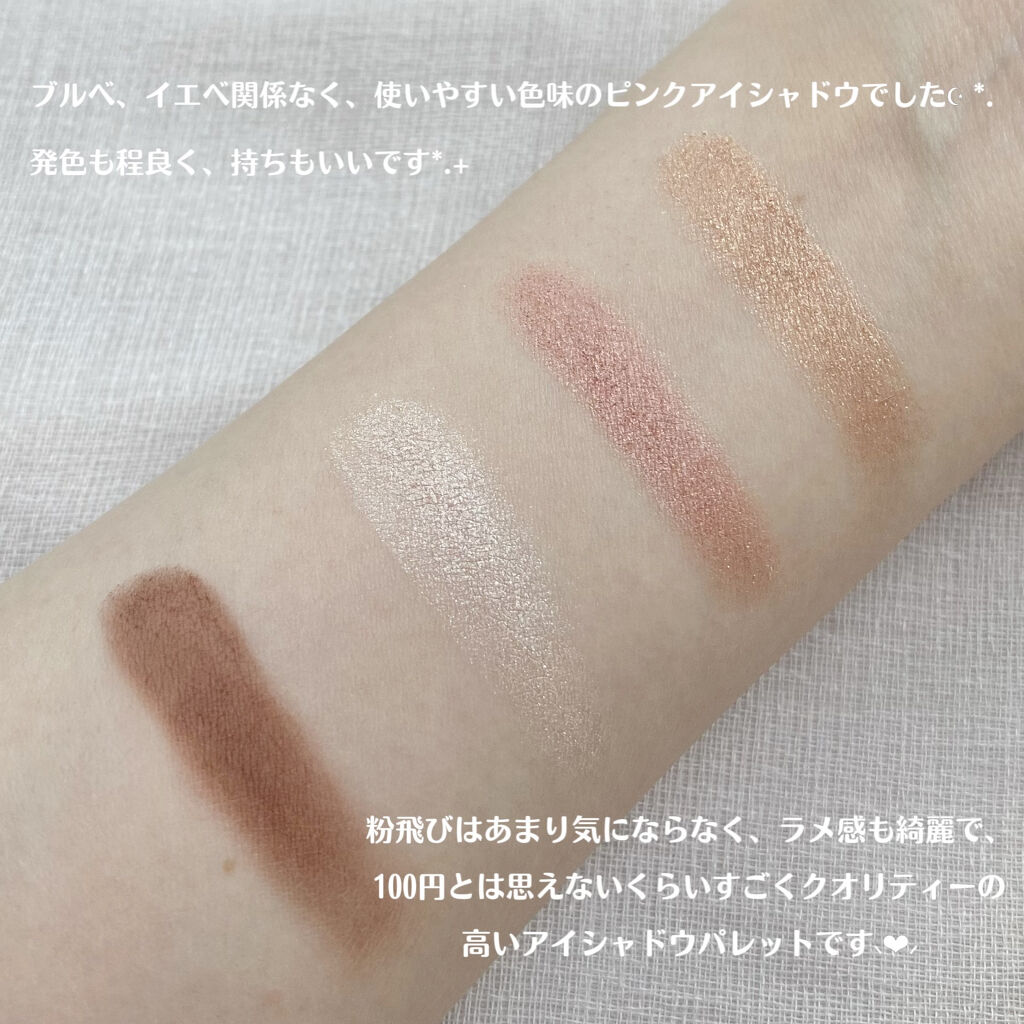 発色よくね?粉質は結構いい どこかのコスメブランドも見習ってほしい リラクシーアイシャドウのシリーズは外れないね 少し粉飛びはするがかなりマシ ブルベ分向き? アイシャドウの質は百均の中ではかなりある