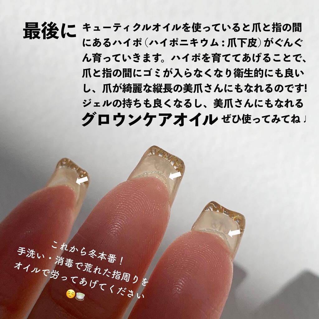 【グロウンケアオイル】キューティクルオイルにも成分で目的、用途が違うそうです😱また、保湿だけではピンクの部分は伸びない‼️⚠️重要な点は、画像最後のページに記載しています。 【植物性のオイル】植物油が主成分のオイルは栄養分もあり浸透して潤うためしっかりと【保湿】される。乾燥した肌や爪に潤いを与えて修復してくれる。浸透するからベタつきが少ない。 【鉱物性のオイル】鉱物油が主成分の代表的なものはミネラルオイル。ミネラルオイルは石油が原料。「保湿」というより「保護」乾燥した肌や爪に浸透せず膜を張り【保護】する。皮膚に乗ったままなのでベタつきを感じやすい。ワセリンなどもそのような感じ。