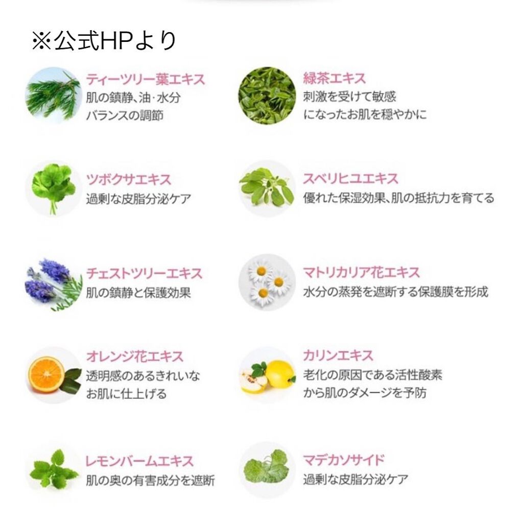 - 水、酸化チタン、シクロペンタシロキサン、メトキシケイヒ酸エチルヘキシル、サリチル酸エチルヘキシル、シクロヘキサシロキサン、BG、安息香酸アルキル(c12-15)、ジポリヒドロキシステアリン酸PEG-30、 オクトクリレン、ジ(カプリル/カプリン酸)BG、酸化亜鉛、ナイアシンアミド、グリセリン、クオタニウム-18ベントナイト、トリメチルシロキシケイ酸、PEG-1ジメチコン、酸化鉄、塩化Na、(アクリルーツ/アクリル酸ステアリル/メタクリル酸ジメチコン)コポリマー、ジメチコン、(カプリル酸/カプリン酸)グリセリズ、水酸化Al、トリエトキシカプリリルシラン、ティーツリー葉水、カルナウバロウ、アデノシン、(ビニルジメチコン/メチコンシルセスキオキサン)クロスポリマー、チャ葉水、1,2-ヘキサンジオール、ツボクサエキス、スベリヒユエキス、セイヨウニンジンボク果実エキス、カミツレ花エキス、オレンジ花エキス、メリッサエキス、カリンエキス、 マデカッソシド、アシアチコシド、アシアチン酸、マデカシン酸