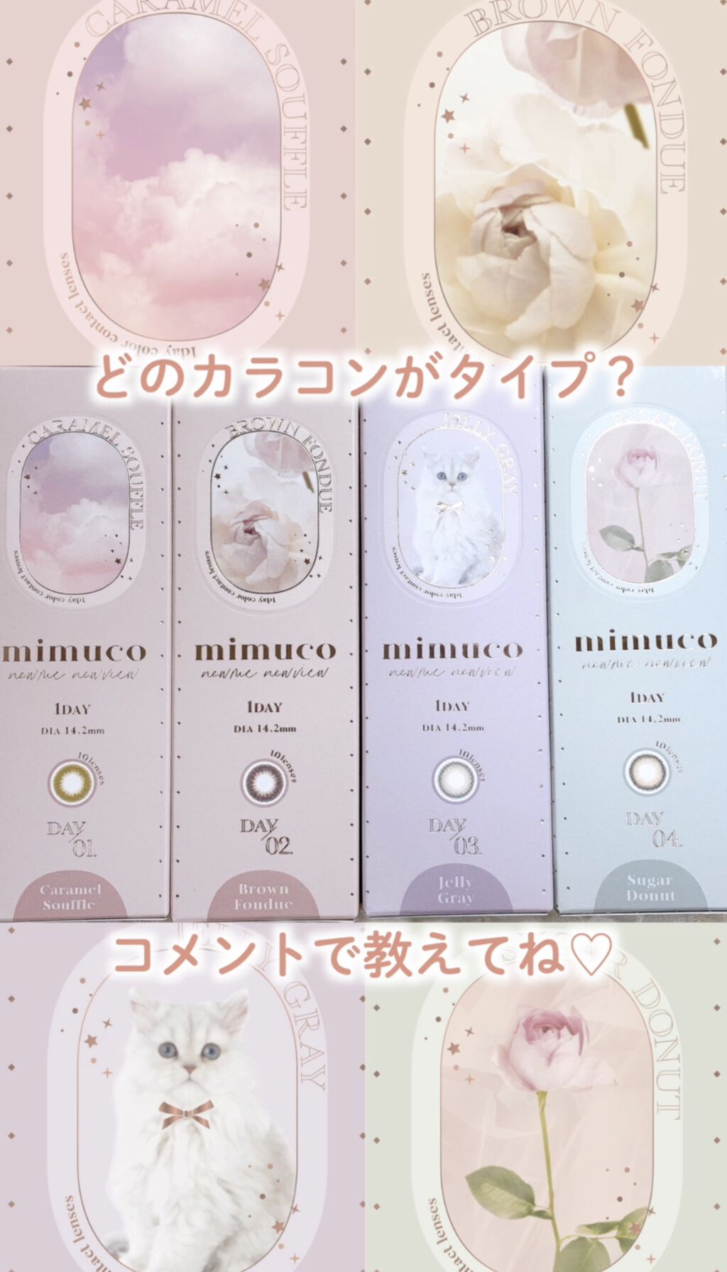 - ※2025年6月以降、商品パッケージ裏面・側面の一部表記を順次変更いたします。尚、これにかかる商品の交換・返品は承っておりません。 裸眼の色が明るい「茶目さん」、暗めな「黒目さん」、どちらの瞳の方が着けても不自然にならずあか抜けるレンズ。 日常使いしやすいブラウンベースのレンズをはじめ、肩ひじ張らずに可愛くなれるナチュラルなレンズとなっております。 ■mimuco ふんわり透明感セット キャラメルスフレ/ブラウンフォンデュ/メープルミルクティー/ポムカヌレ(各2枚入り) ■mimucoちゅるん透明感セット ゼリーグレー/シュガードーナツ/メローストロベリー/ピュレグレージュ(各2枚入り) カラーコンタクトレンズの不適正使用による眼障害の危険性等などがあります。 ●コンタクトレンズは高度管理医療機器です。不十分な洗浄・消毒など不適切なケアや、長時間・交換期間を超えた装用により、アレルギー性結膜炎、角膜感染症、角膜潰瘍等の重篤な眼障害が発生する危険性があります ●ご使用前に取扱説明書を確認してください 使用上の留意事項 ●眼科医院等を受診してからお求めください ●眼に異常を感じたら直ちにレンズ使用を中止し、お近くの眼科等で診察を受けてください ●医師の指示にしたがってご使用ください ●コンタクトレンズを装用する場合、自覚症状がなくても、眼科医院等での定期検査を受けてください ●レンズに不具合がある場合は使用しないでください